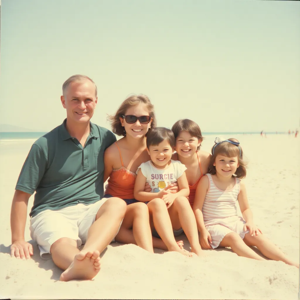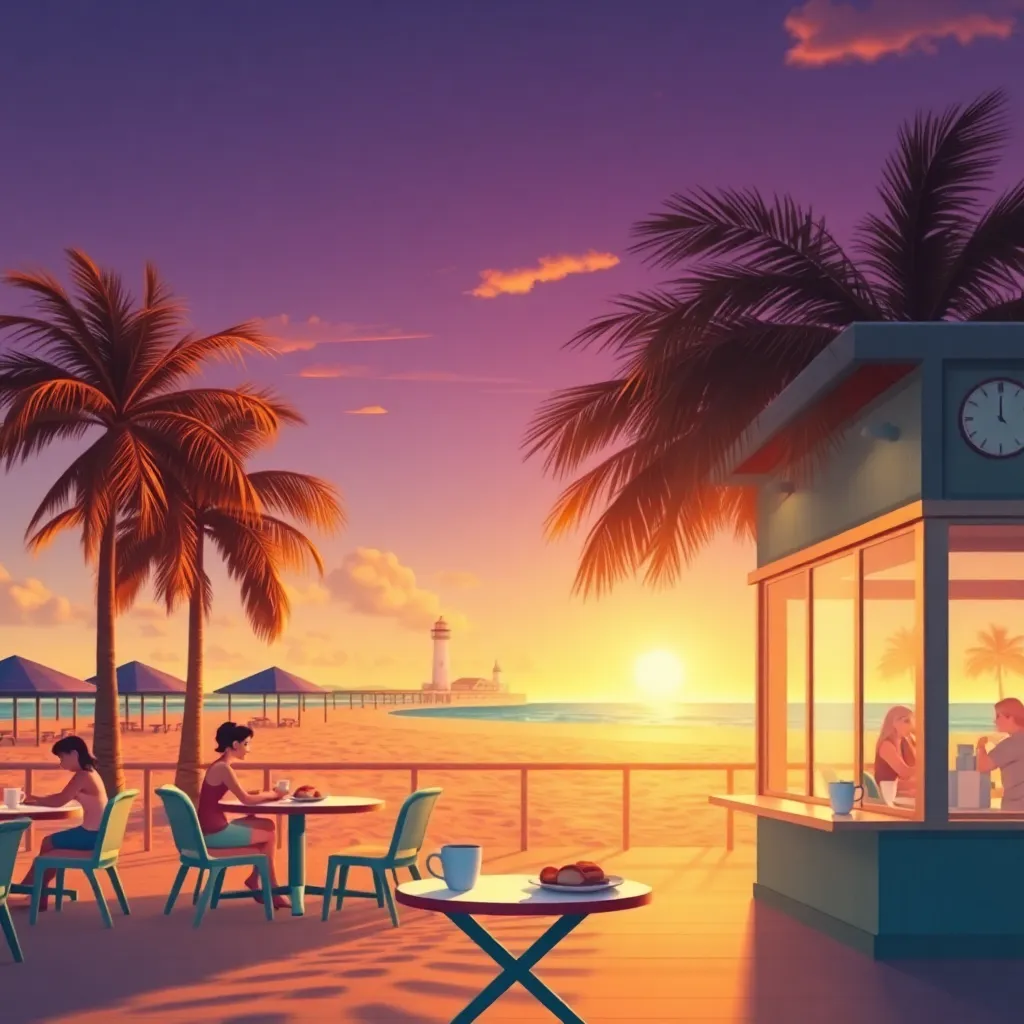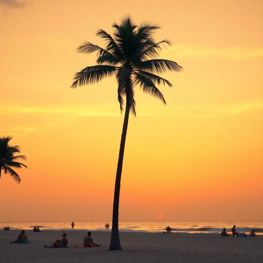 Generate a high-resolution image of a serene beach scene at sunset. The sky should be a warm orange-yellow color with a few wispy clouds. In the foreground, a lone palm tree stands tall, with a few people relaxing on colorful beach towels. The image should be sharp and detailed, with a sense of calm and tranquility.