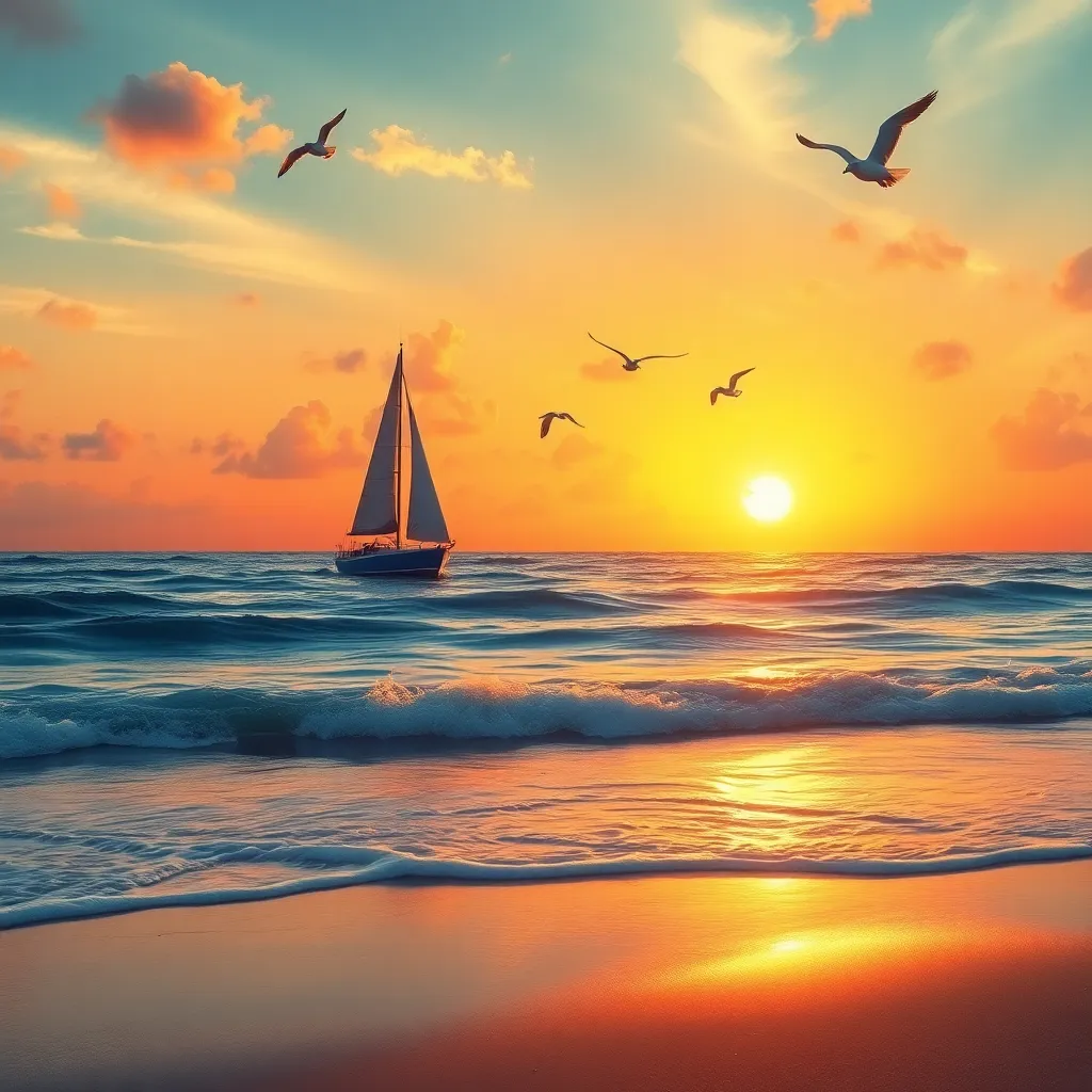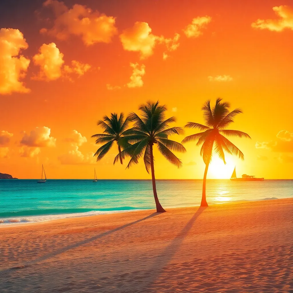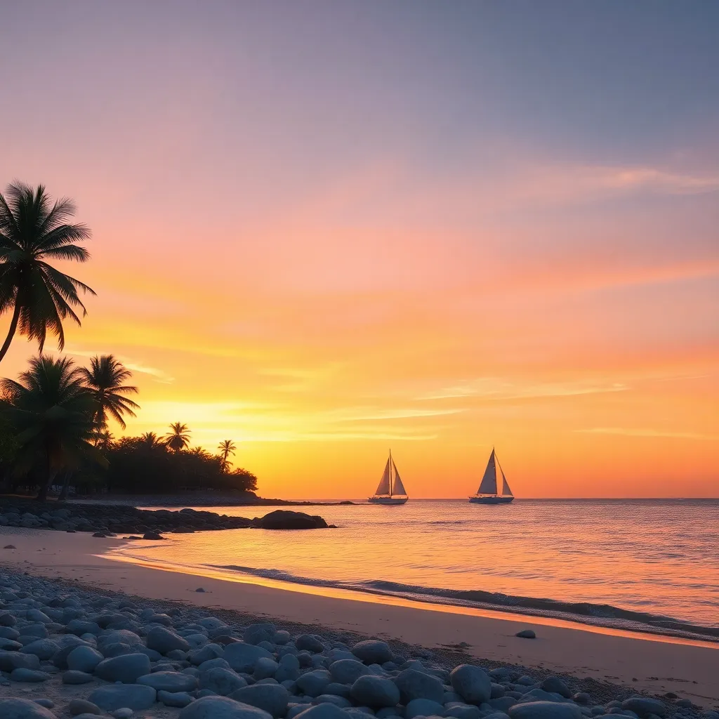 Generate an image of a serene beach at sunset. The sky is painted with warm hues of orange and pink. A few palm trees sway gently in the breeze. In the distance, a sailboat glides across the calm waters. The shore is lined with smooth rocks and shells. Create a high-resolution image with vivid colors and details.