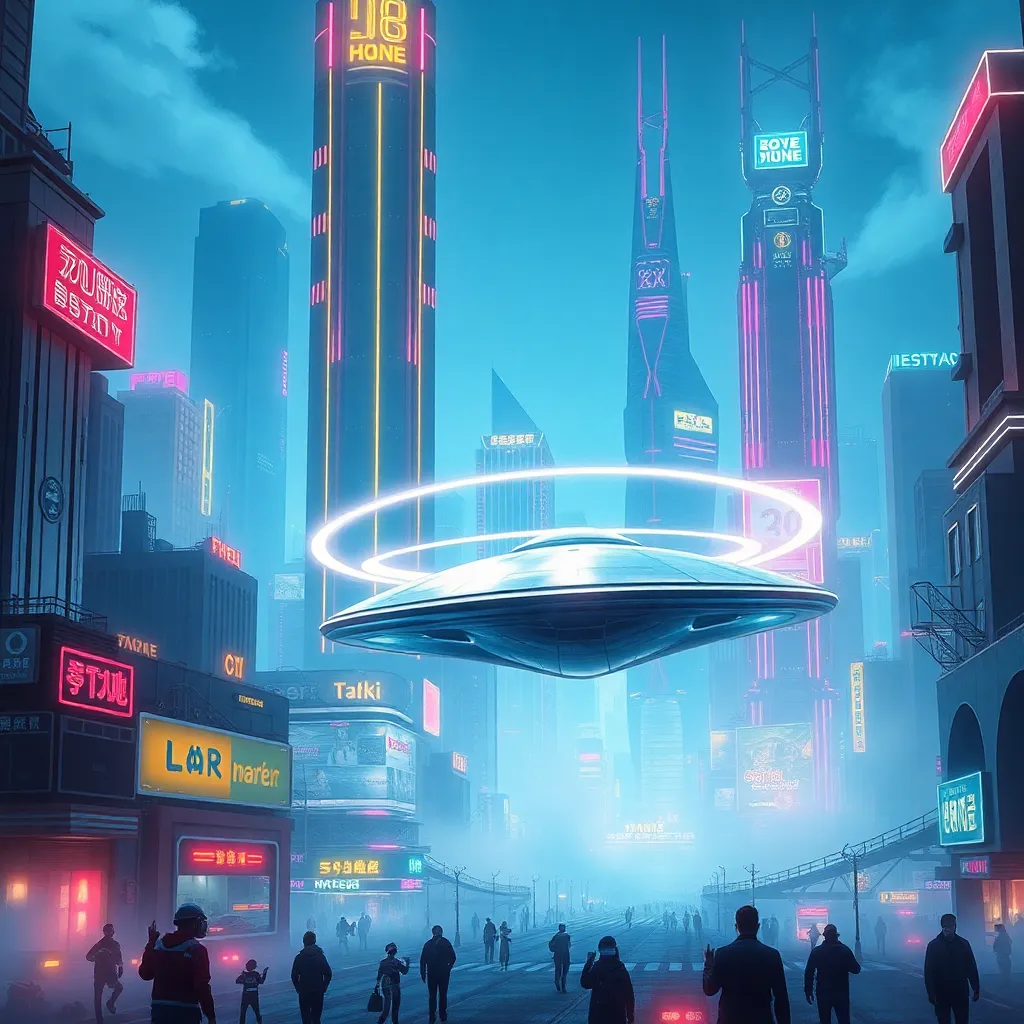 Generate a vibrant, futuristic cityscape with towering skyscrapers and neon lights. Include a sleek, silver spaceship landing in the foreground, surrounded by a halo of light. The city should be bustling with activity, with people and robots moving about. Incorporate a subtle, misty atmosphere to add depth and mystery.