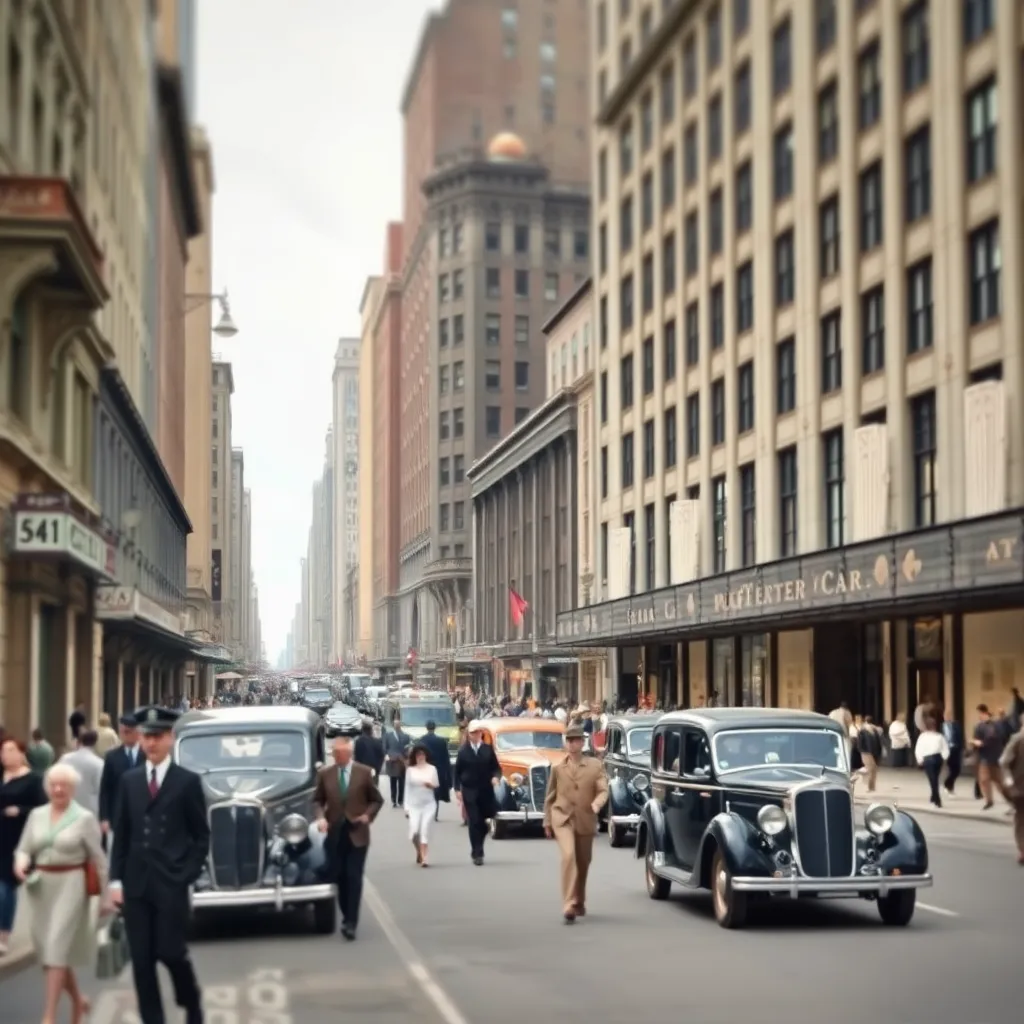 Enhance a historic photograph of a bustling city street from the 1920s. The image is blurry and faded, with people and buildings barely visible. Use AI to unblur the image, revealing the vibrant colors and details of the era, including the art deco architecture, vintage cars, and stylishly dressed pedestrians.