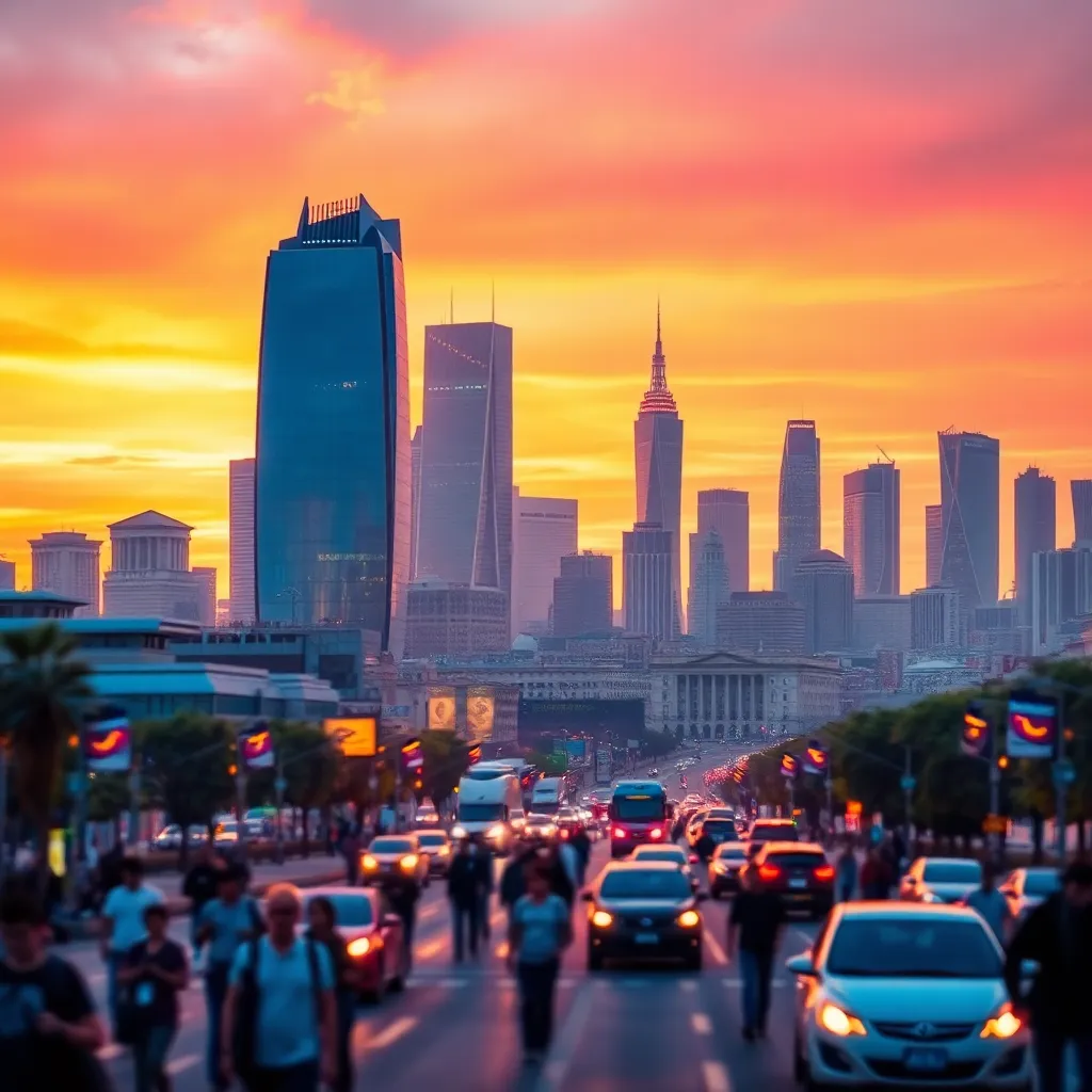 Create a futuristic cityscape at sunset with a blurred foreground of pedestrians and cars. The city skyline should be sharp and vibrant, with a mix of modern skyscrapers and ancient architectural landmarks. The dominant colors should be warm oranges, yellows, and pinks. The atmosphere should be lively and energetic.