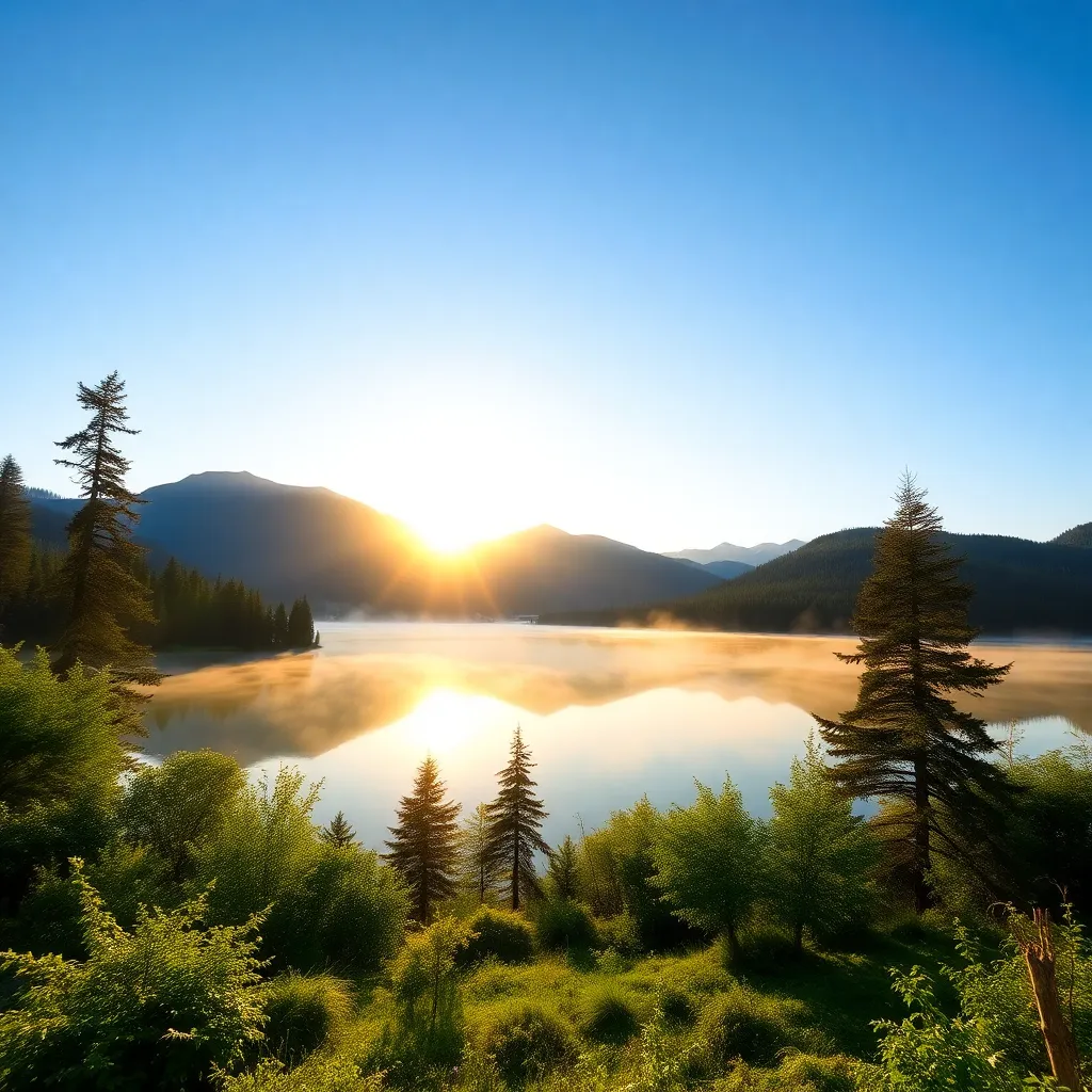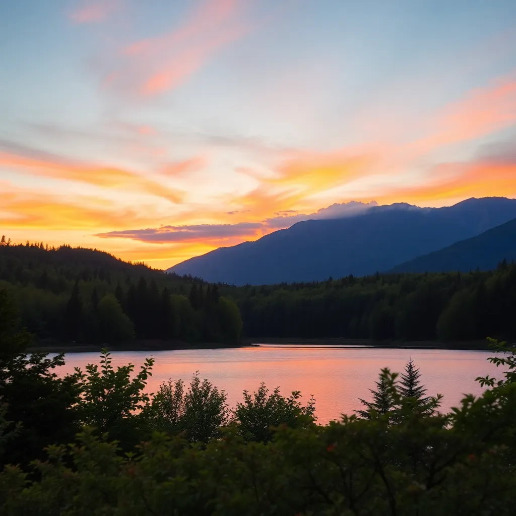 Create a stunning sunset landscape with a serene lake in the foreground, surrounded by lush green trees and a distant mountain range. Incorporate vibrant colors and soft, warm lighting. The atmosphere should be peaceful and inviting. Use AI to unblur the image and make it look like a breathtaking real-life scene.