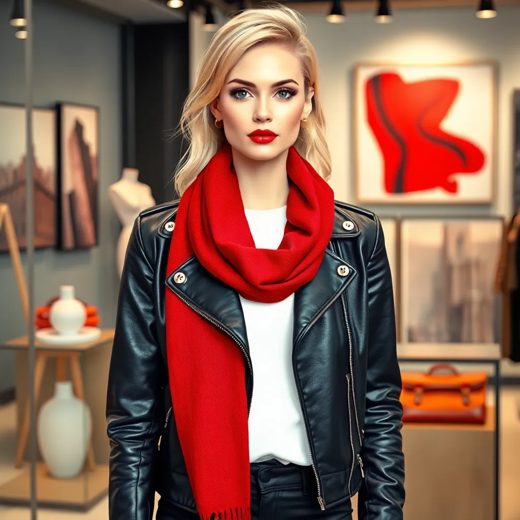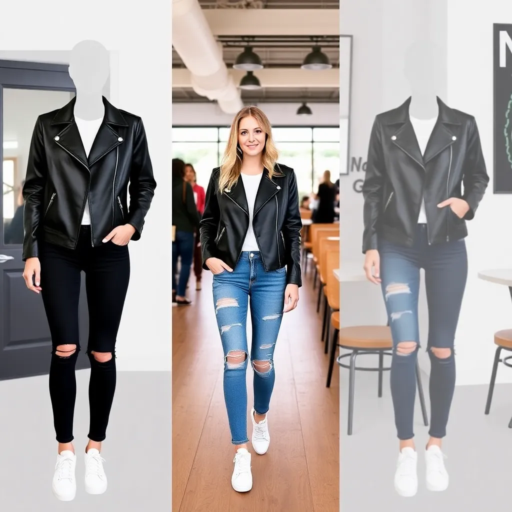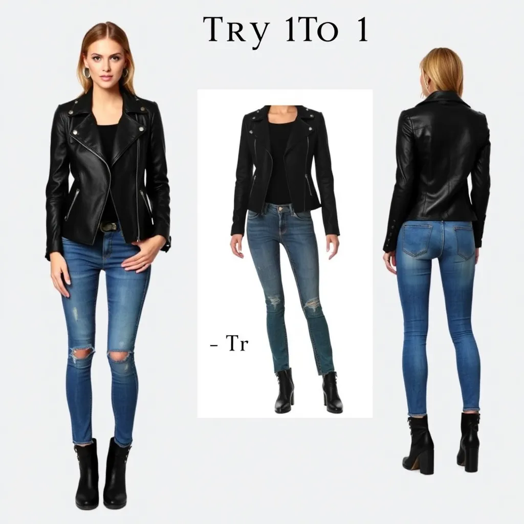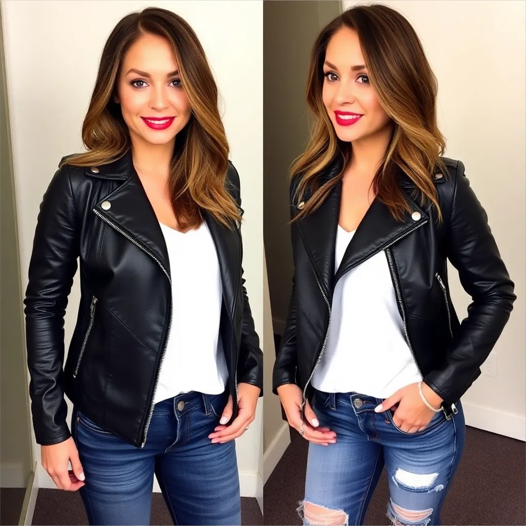 Imagine yourself trying on a sleek black leather jacket with silver accents, a bold red lip color, and a pair of distressed denim jeans. The jacket fits perfectly, accentuating your toned arms and shoulders. The vibrant lip color makes your eyes sparkle. The jeans are comfortable and stylish. How do you look?