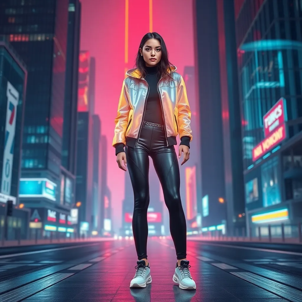 Imagine yourself in a futuristic city, surrounded by towering skyscrapers and neon lights. You're wearing a sleek, high-tech outfit with a holographic jacket and futuristic sneakers. Take a step forward, and let's virtually try on this futuristic attire together, capturing your style and personality in an AI-generated image!