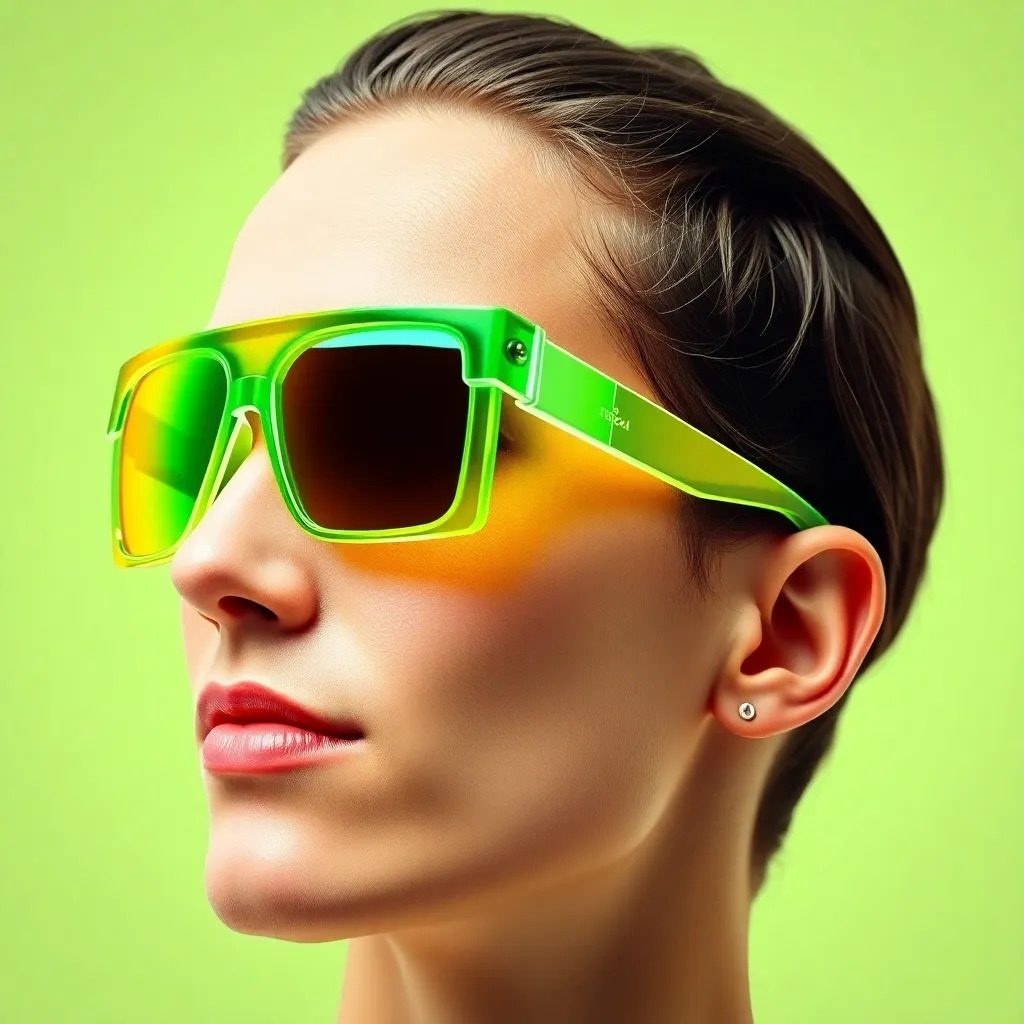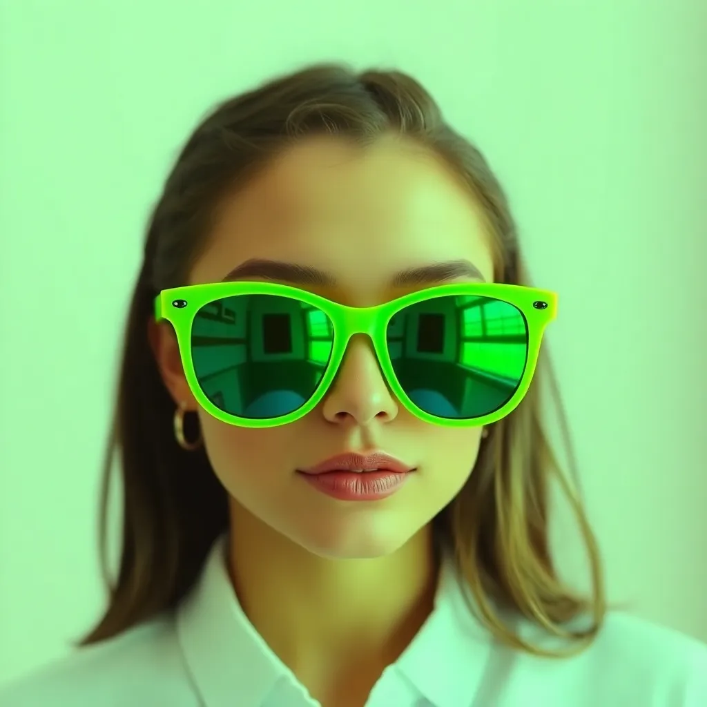 Imagine yourself trying on a stylish pair of futuristic sunglasses with neon green frames and mirrored lenses. The virtual try-on feature seamlessly superimposes the glasses onto your face, allowing you to see how they'd look on you. What's your reaction when you see yourself rocking this trendy accessory?