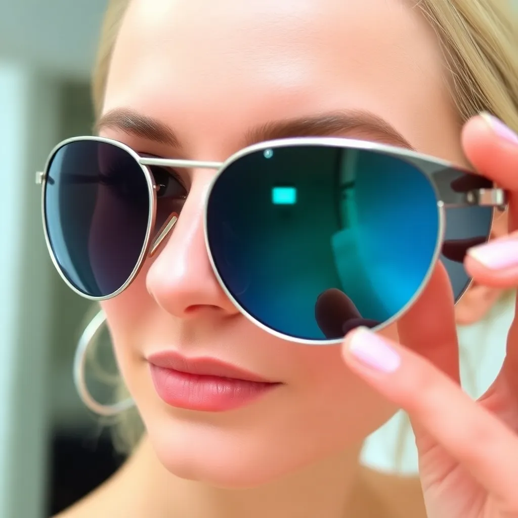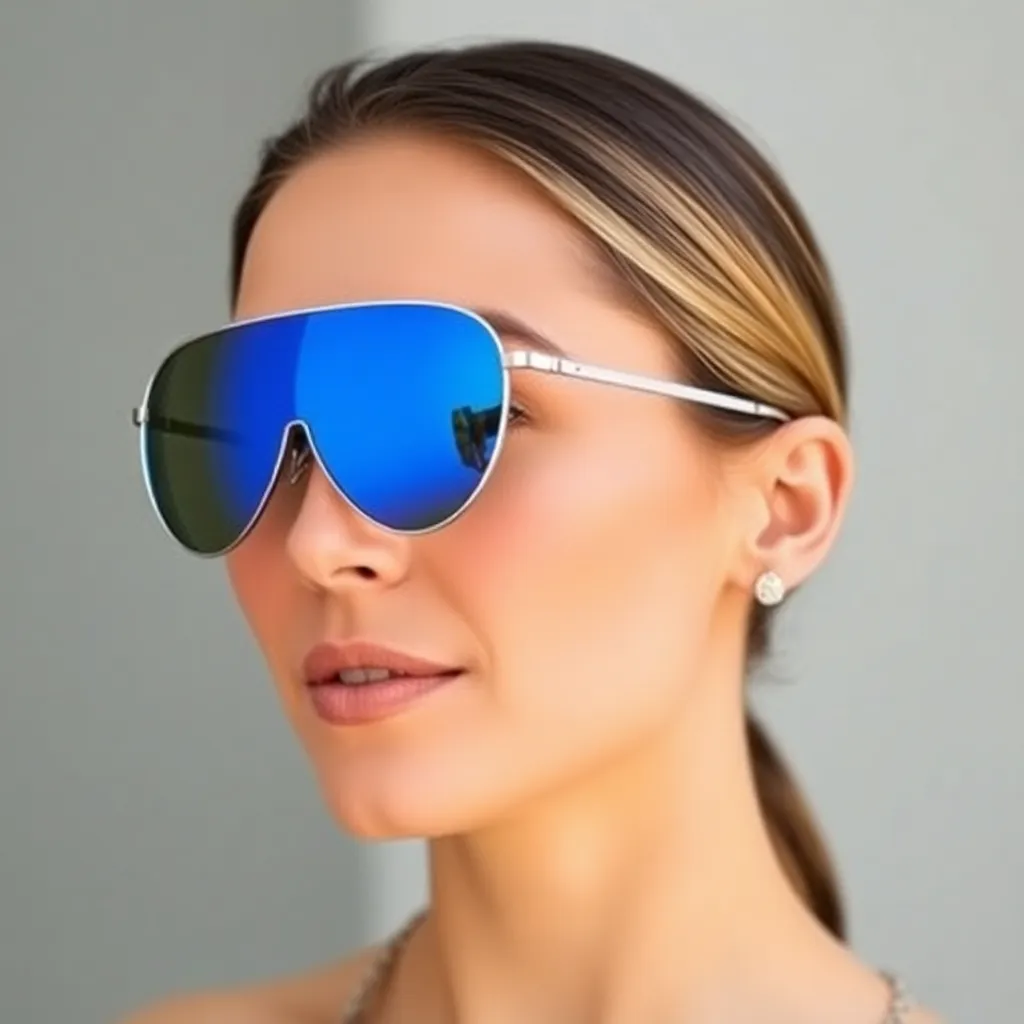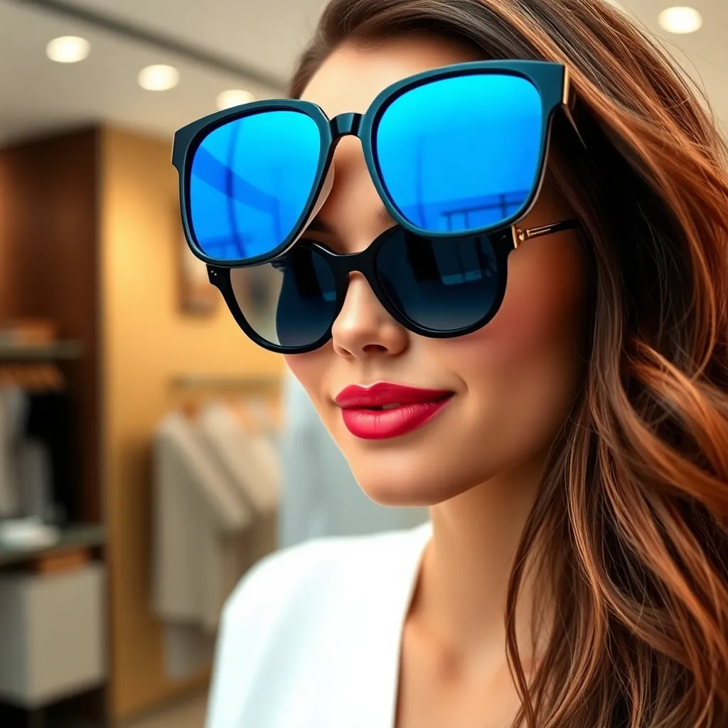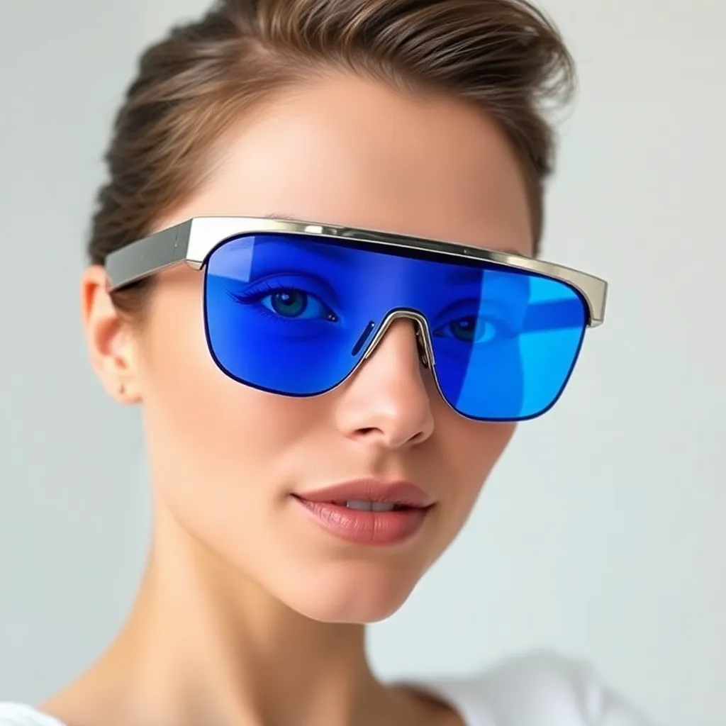 Imagine yourself trying on a trendy pair of sunglasses at a luxury boutique. The frames are sleek and modern, with bright blue lenses that add a touch of sophistication to your overall look. What do you see when you look in the mirror? Create a virtual try-on image that showcases your stylish new shades.