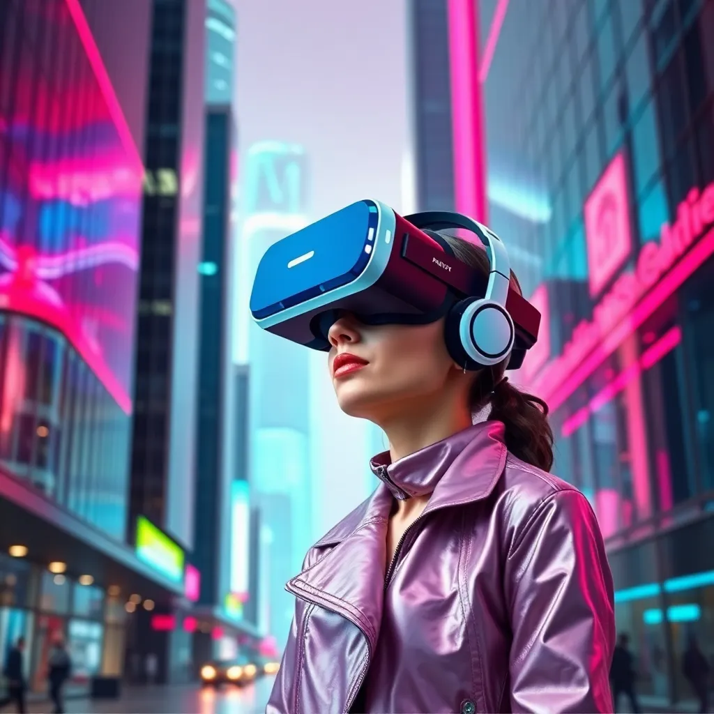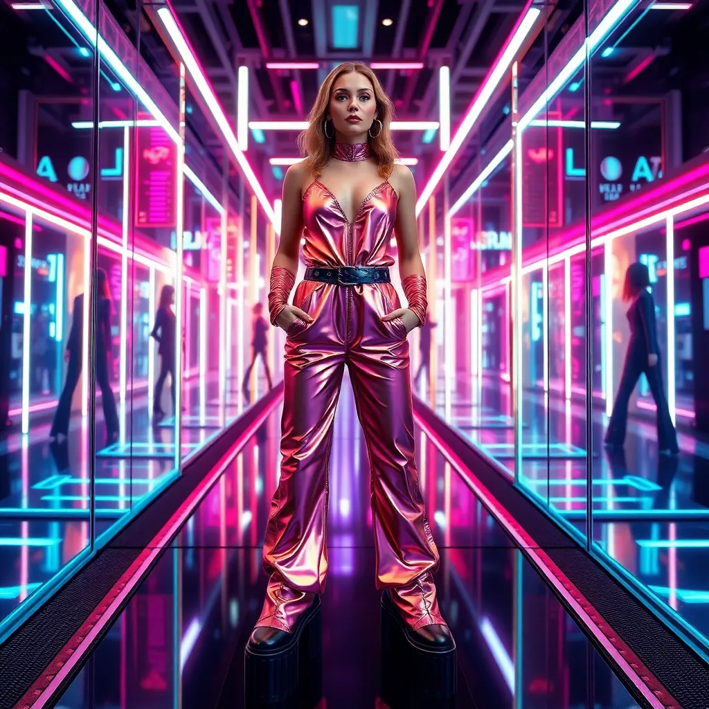 Imagine yourself trying on a trendy, futuristic outfit in a virtual try-on experience. You're surrounded by a neon-lit cityscape, with holographic mirrors and catwalks. Choose a bold, metallic jumpsuit with iridescent accents and oversized, chunky boots. How do you look in this out-of-this-world ensemble?