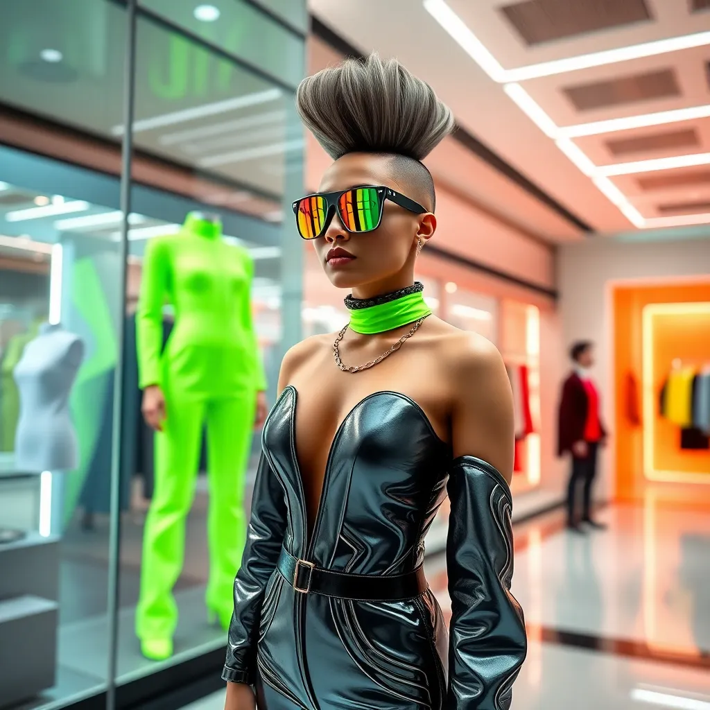 Imagine a futuristic fashion boutique where customers can try on virtual outfits. Design a futuristic storefront with a sleek, high-tech interior. The customer is trying on a bold, neon green jumpsuit with mirrored sunglasses and a futuristic hairstyle. The AI-generated image should showcase the outfit in a 3D virtual try-on setting.