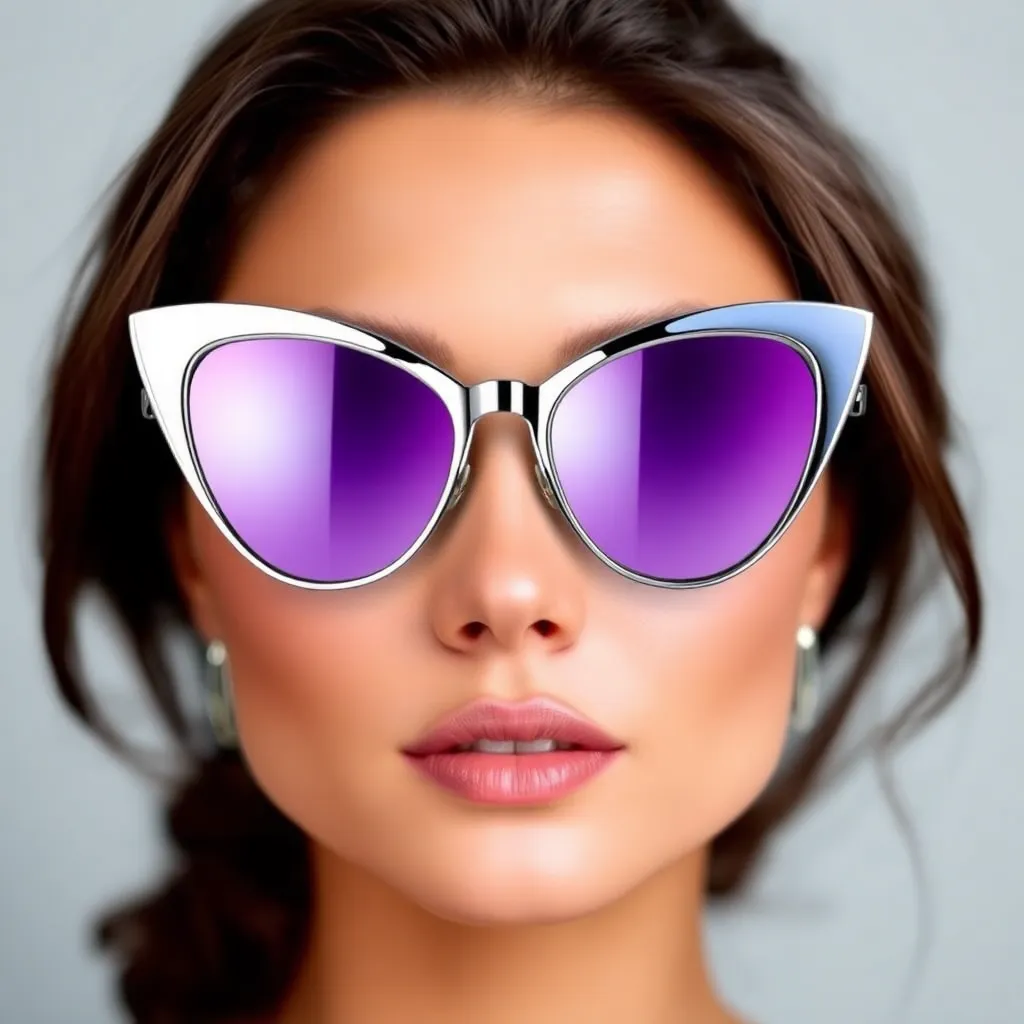 Imagine yourself trying on a stunning pair of cat-eye sunglasses with mirror-finish frames and gradient lenses that shift from silver to purple. The virtual try-on experience lets you see how they'd look on your face, adjusting the fit and angle to perfection. How do you look in these stylish specs?