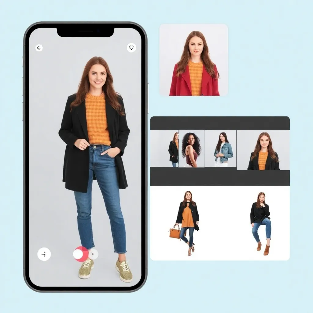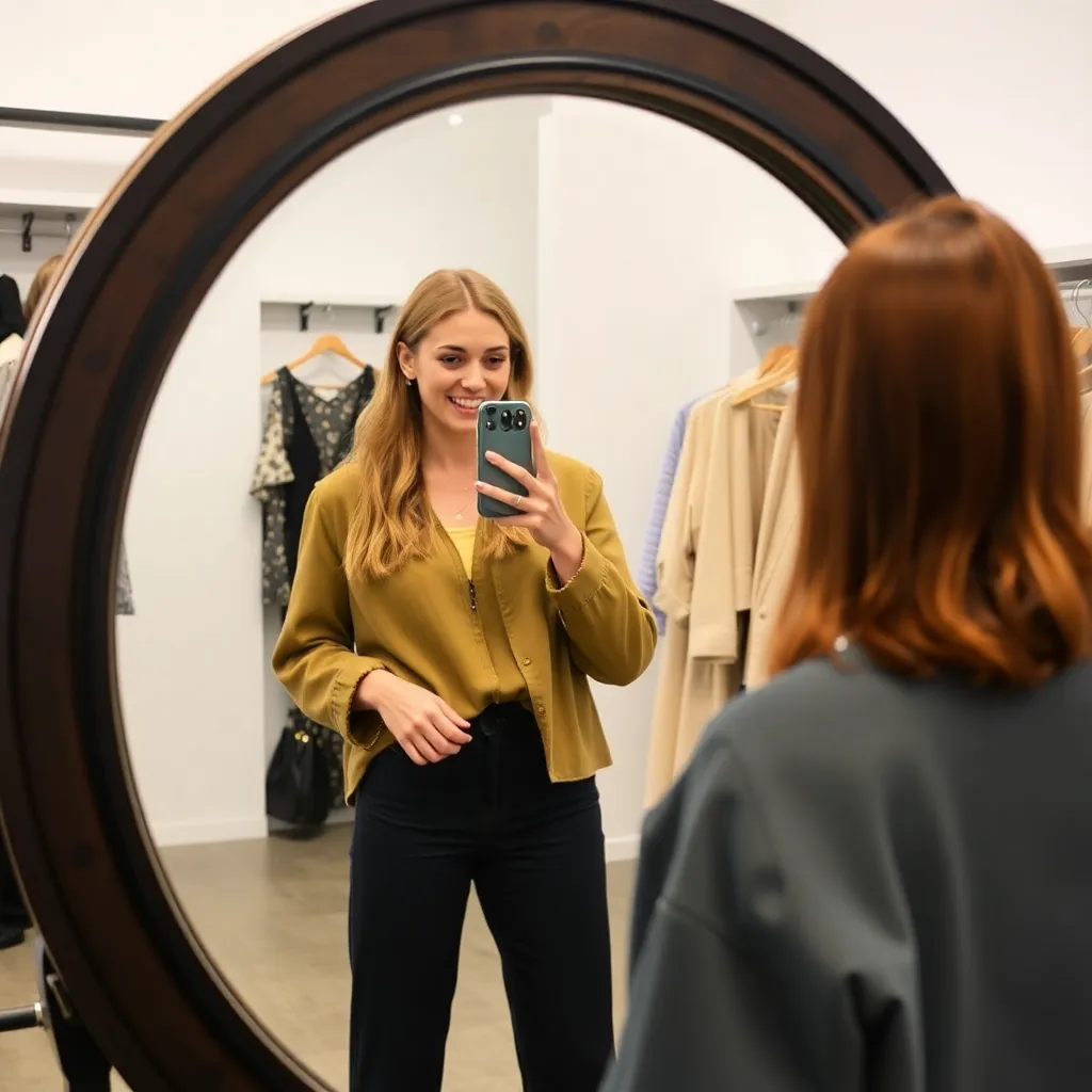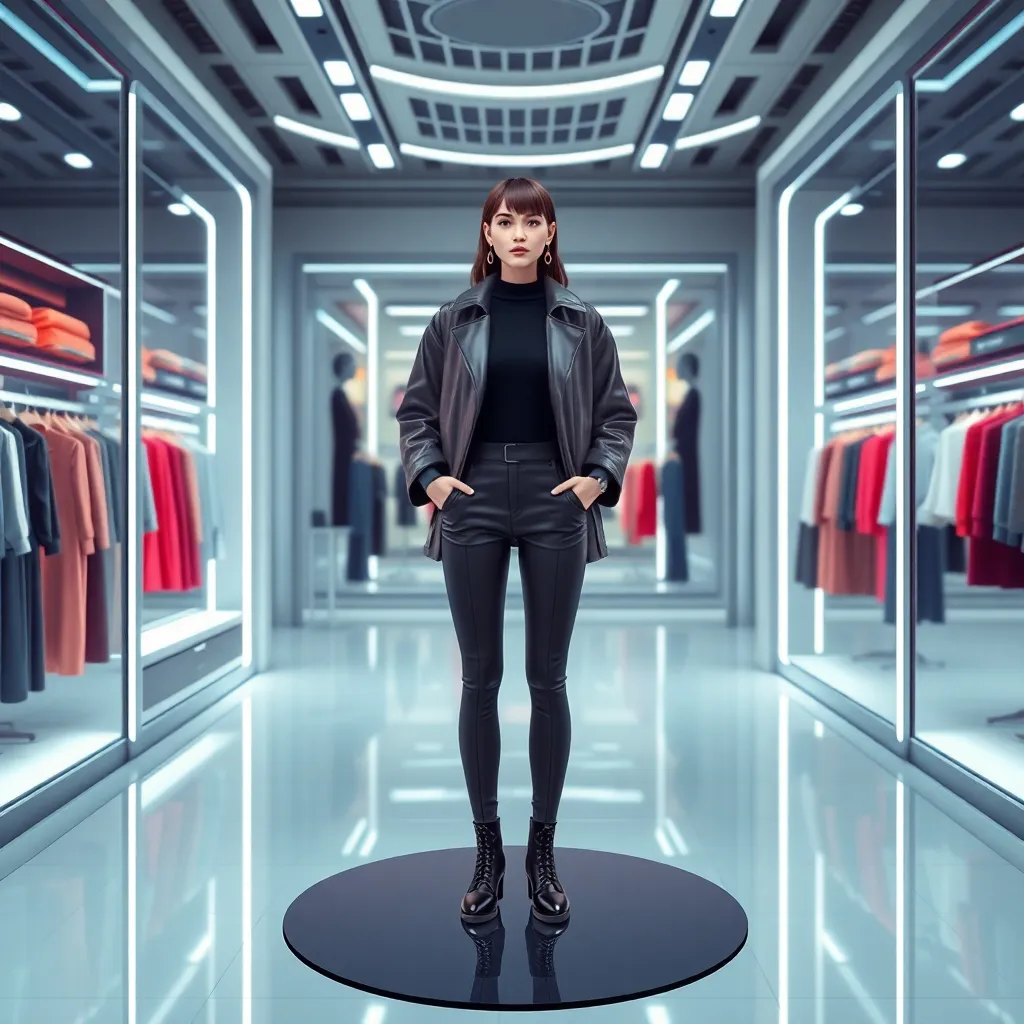 Imagine a futuristic fashion boutique where customers can try on virtual outfits without leaving their homes. Design a futuristic virtual try-on experience where users can upload their 3D avatar and try on various outfits, accessories, and hairstyles. Create an AI-generated image showcasing a user trying on a trendy virtual outfit.