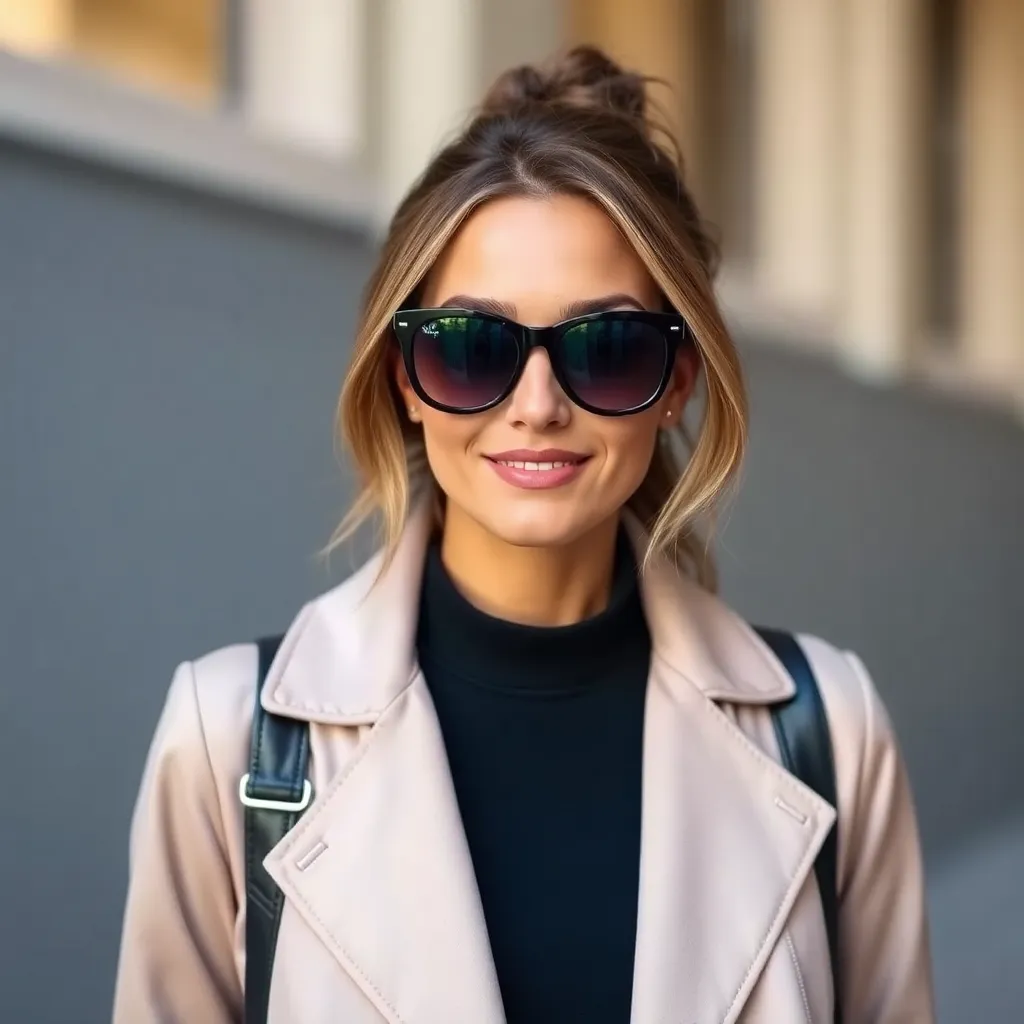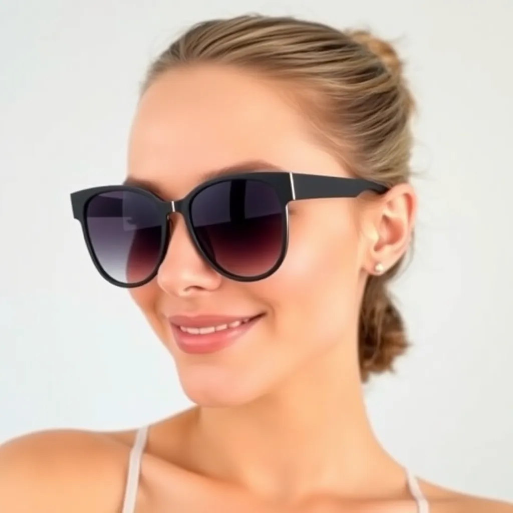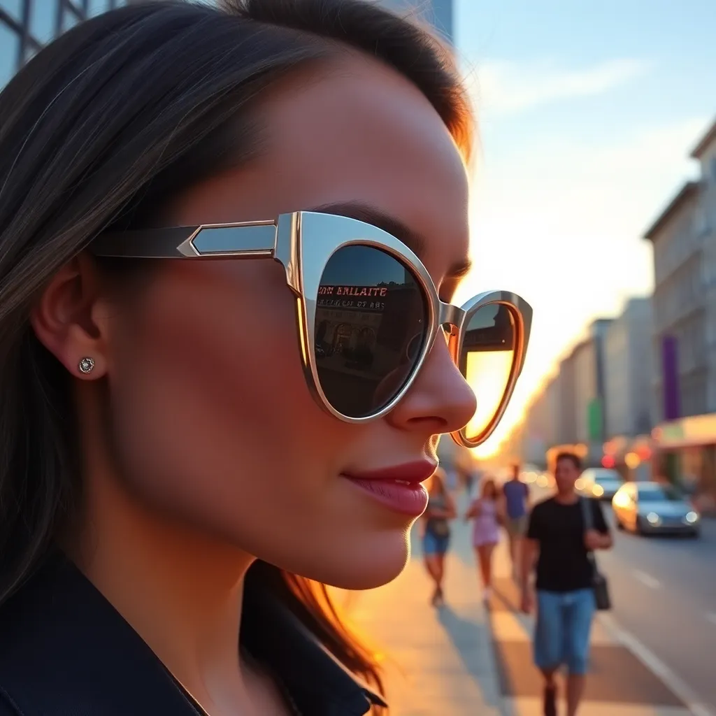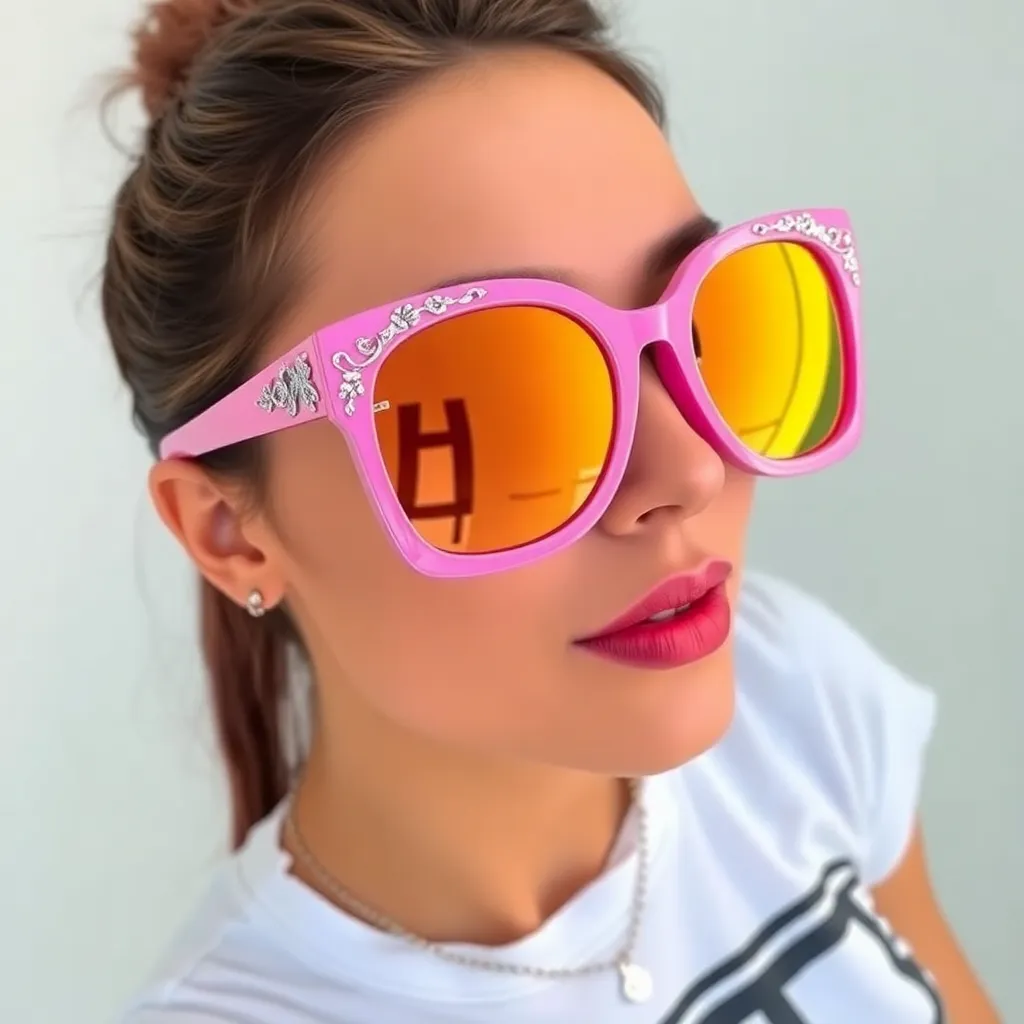 Imagine yourself trying on a stunning pair of oversized, trendy sunglasses with brightly colored frames and sleek, mirrored lenses. The frames are adorned with intricate details and have a retro-chic vibe. Generate an AI image of yourself wearing these unique sunglasses, showcasing your stylish and playful personality.
