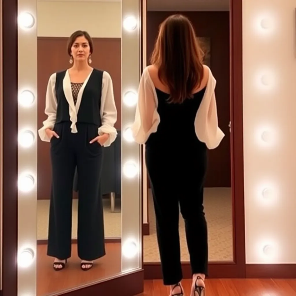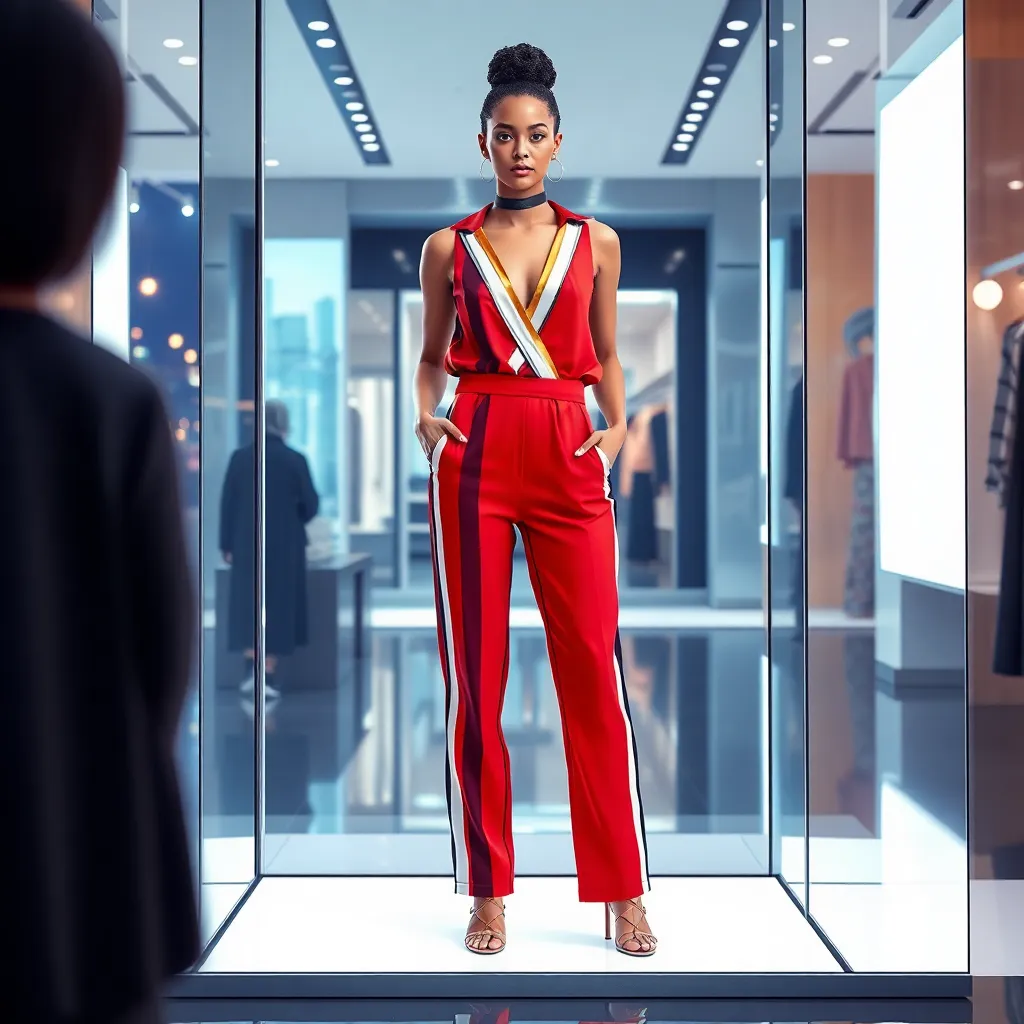Imagine a futuristic fashion boutique where customers can try on trendy outfits virtually. Create an AI-generated image of a person wearing a stylish jumpsuit with bold stripes and metallic accents, standing in front of a sleek mirror with a cityscape background. Incorporate interactive 3D effects to enhance the virtual try-on experience.