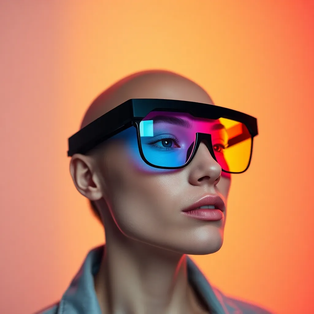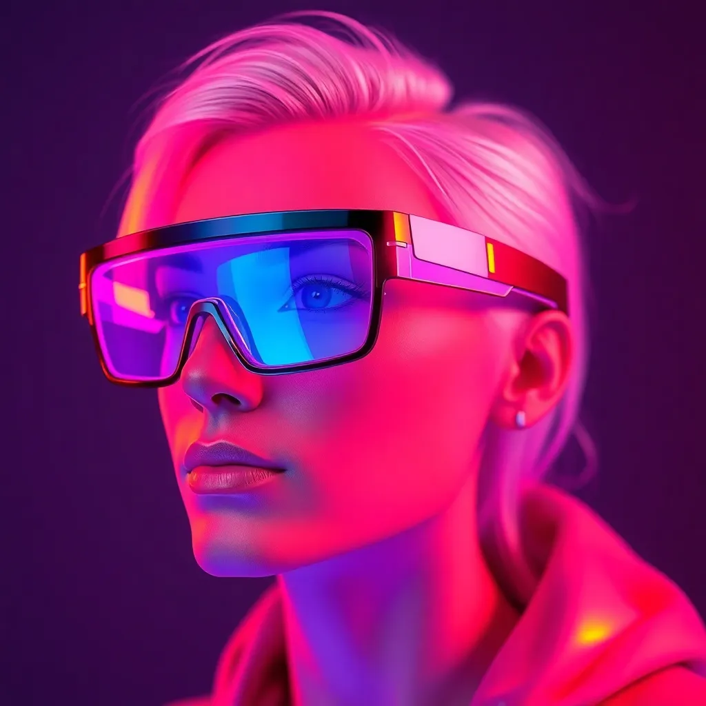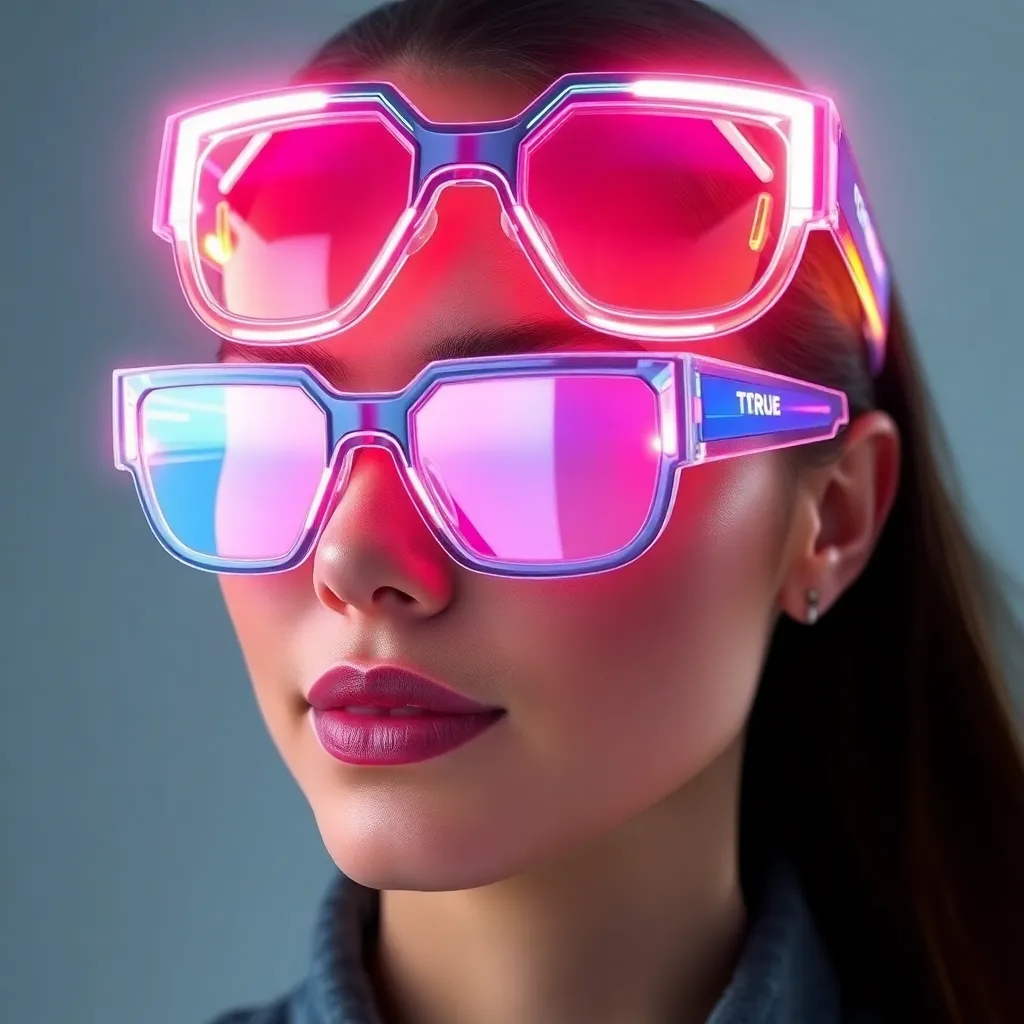 Imagine trying on a futuristic pair of augmented reality glasses that change color and design based on your mood. Create a visually stunning virtual try-on experience showcasing the glasses' adaptability, with a focus on vibrant colors and sleek design. The AI-generated image should evoke a sense of innovation and style.