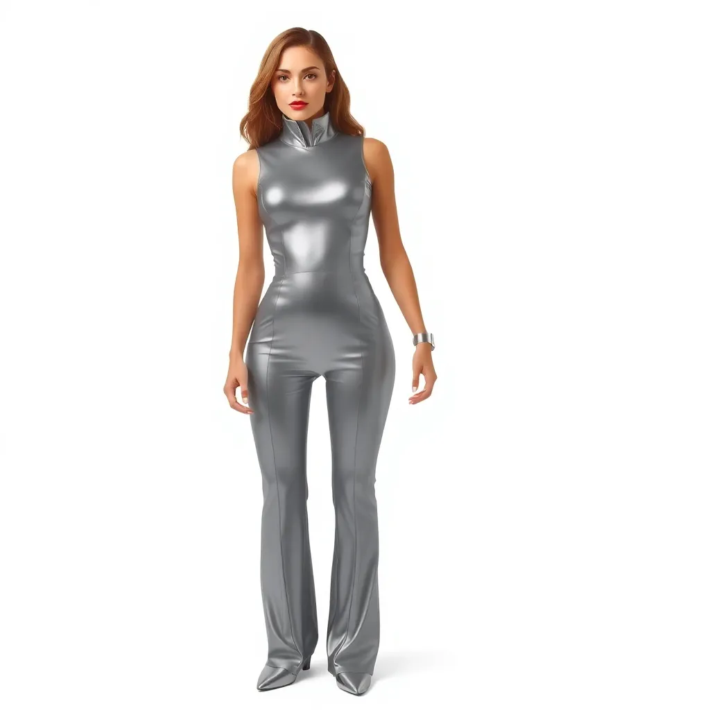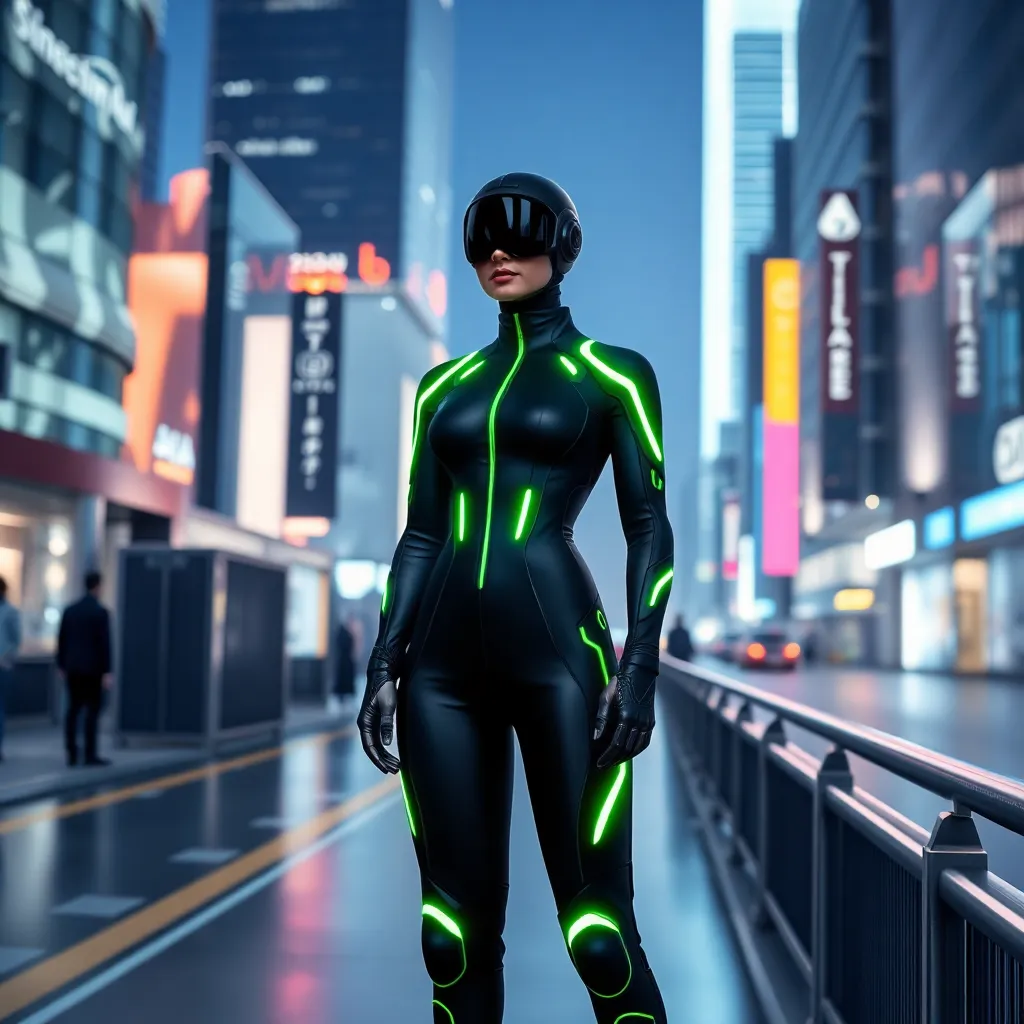 Imagine yourself in a futuristic city, wearing a sleek black jumpsuit with neon green accents. The jumpsuit has a built-in AI chip that allows you to change the color and design of your outfit with just a thought. Take a step into the virtual try-on experience and see yourself in this futuristic attire!