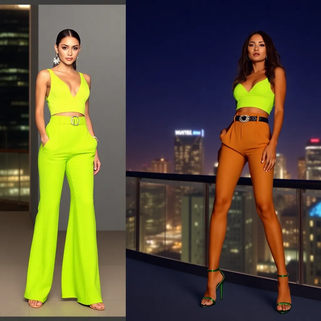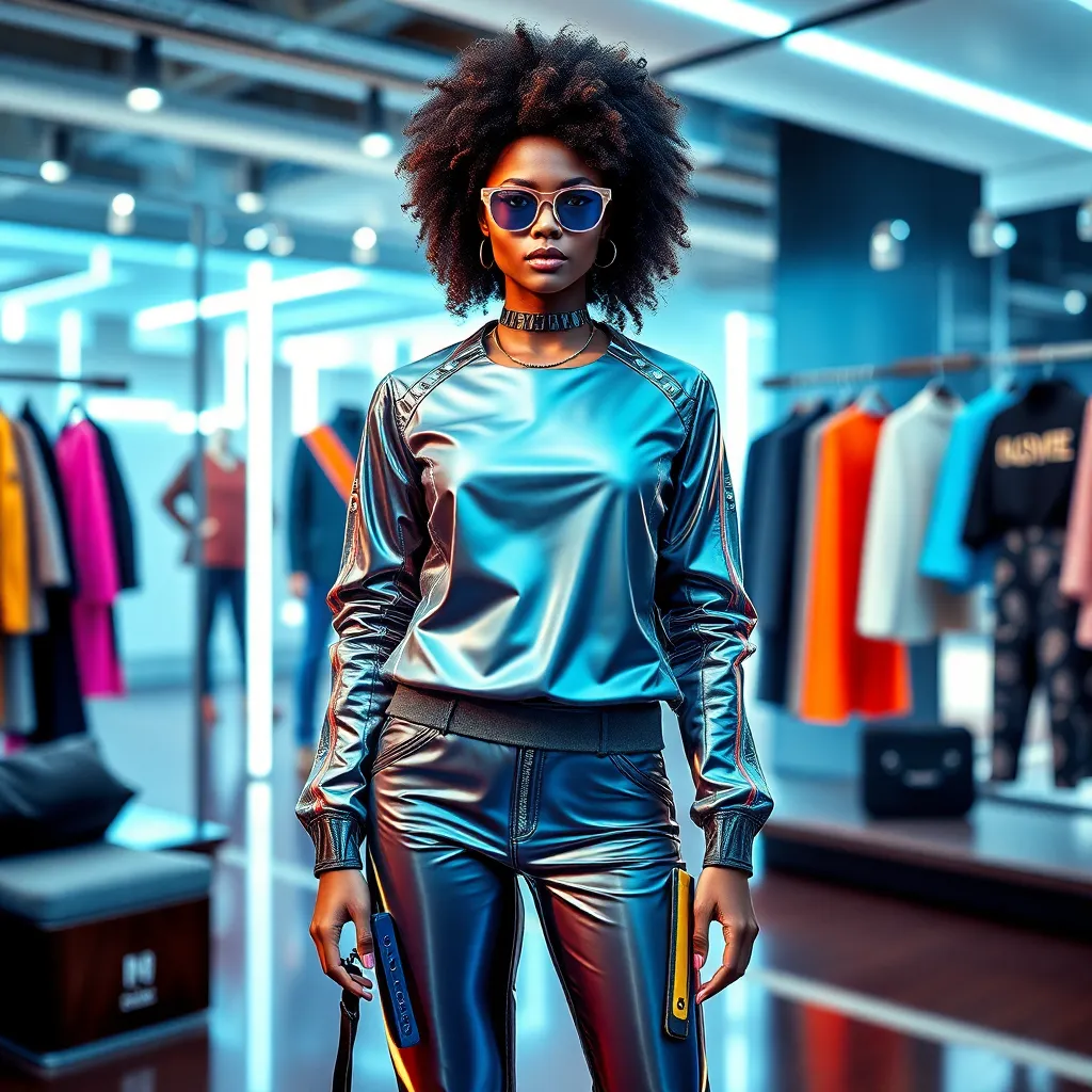 Imagine a futuristic fashion showroom where customers can virtually try on stylish outfits. Generate an AI image of a trendy outfit, complete with accessories, on a diverse model in a chic setting. The outfit should be a fusion of high-tech materials and sustainable fabrics, with a bold, neon color scheme.