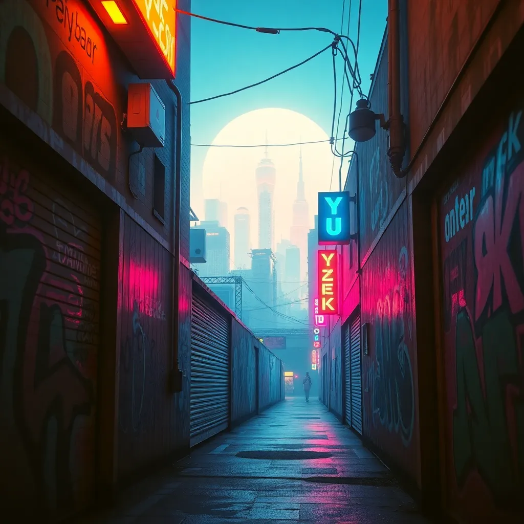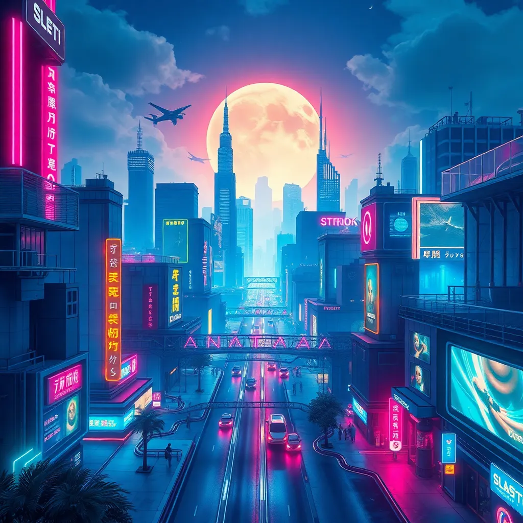 Create an AI-generated image of a futuristic cityscape at dusk, with a retro-futuristic twist. Incorporate neon-lit skyscrapers, a crescent moon, and a hint of nostalgia. The atmosphere should be dreamy and slightly eerie, as if the world is on the cusp of a technological revolution. Think Y2K meets Blade Runner.
