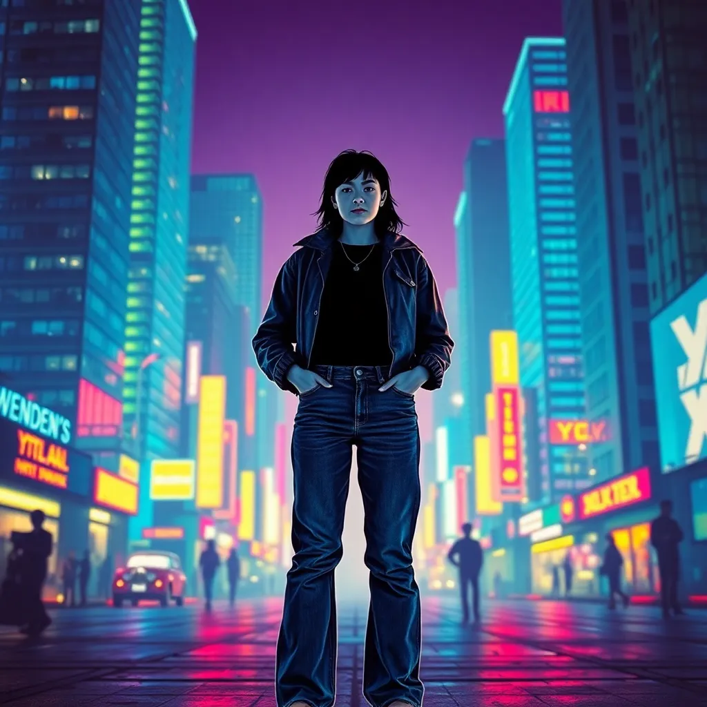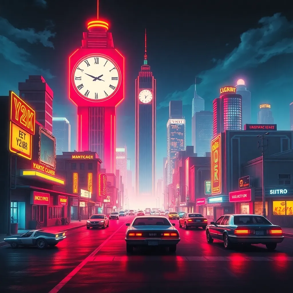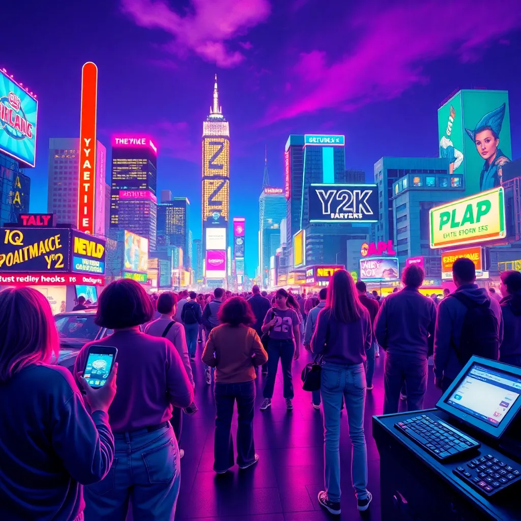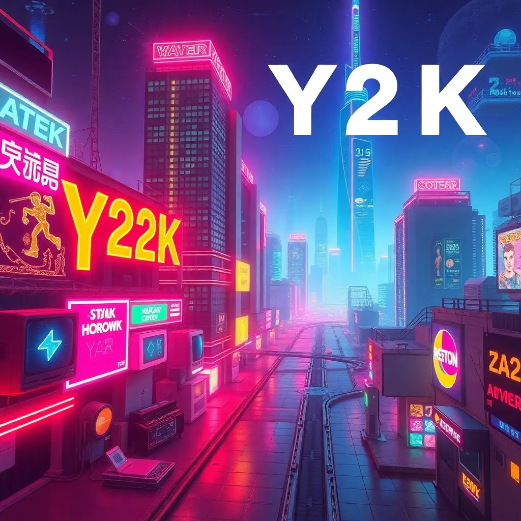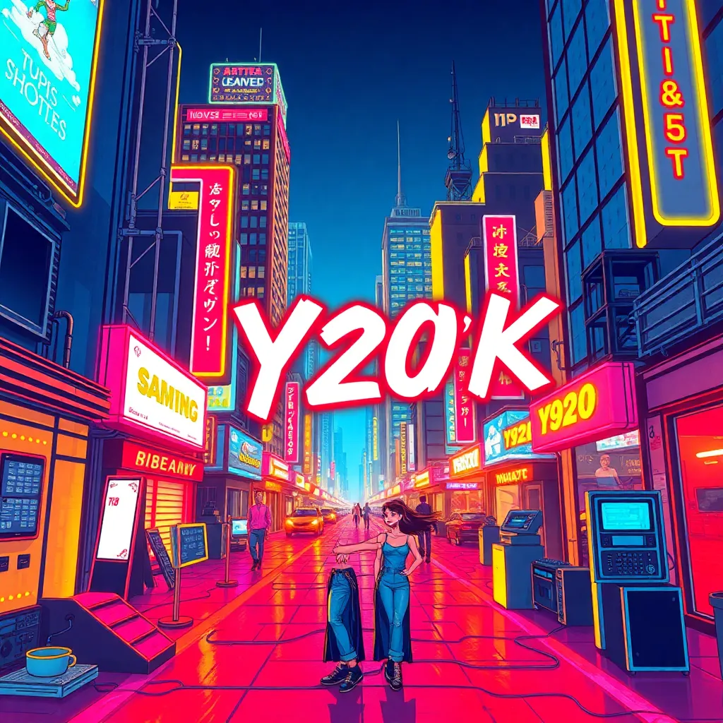 Create an image that captures the essence of the Y2K era. Incorporate elements of neon-lit cityscapes, retro-futuristic architecture, and a sense of nostalgia. Think flip phones, frosted tips, and low-rise jeans. Use a palette of bold colors and bold graphics to evoke the era's playful and rebellious spirit.