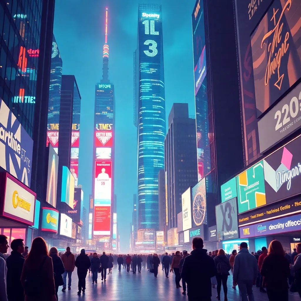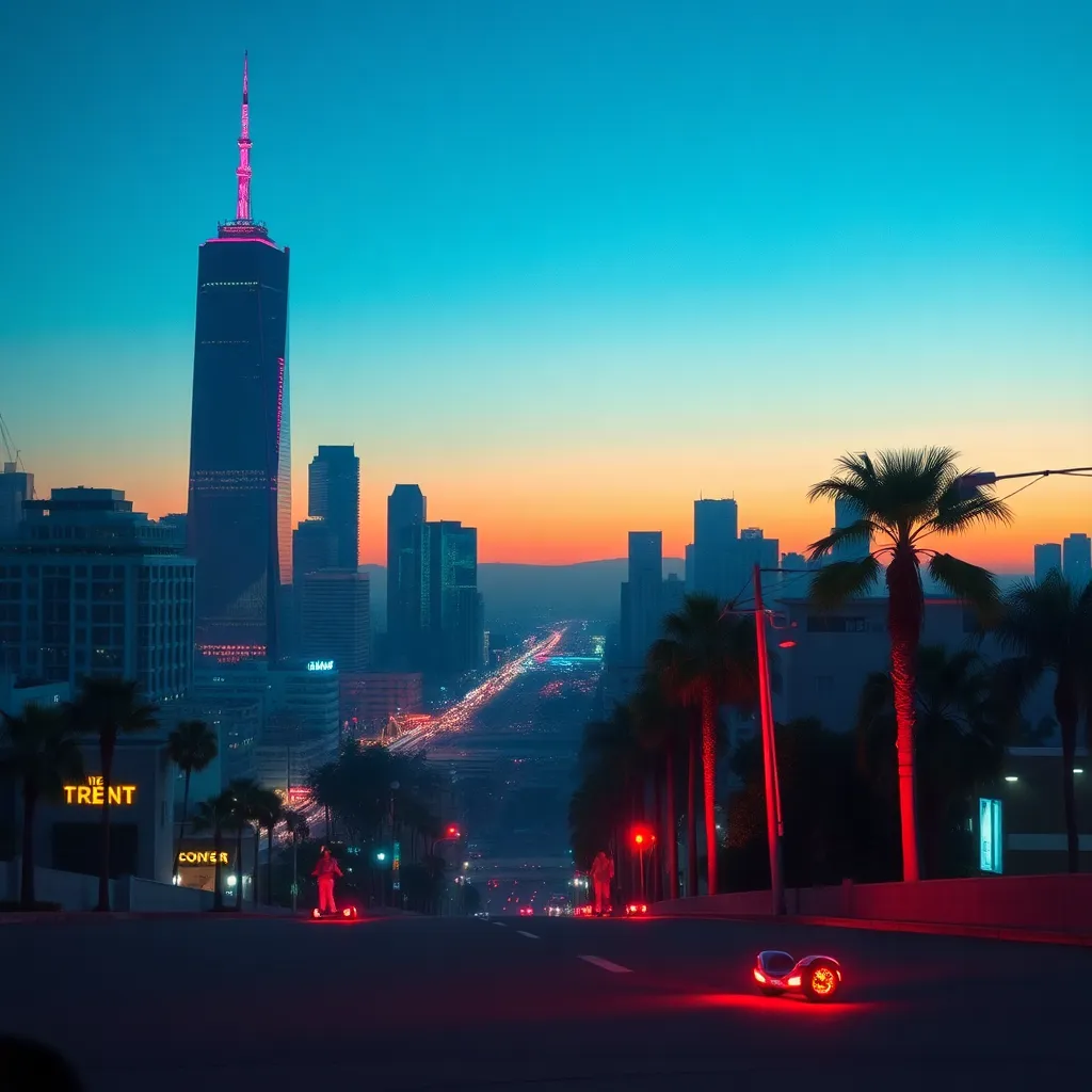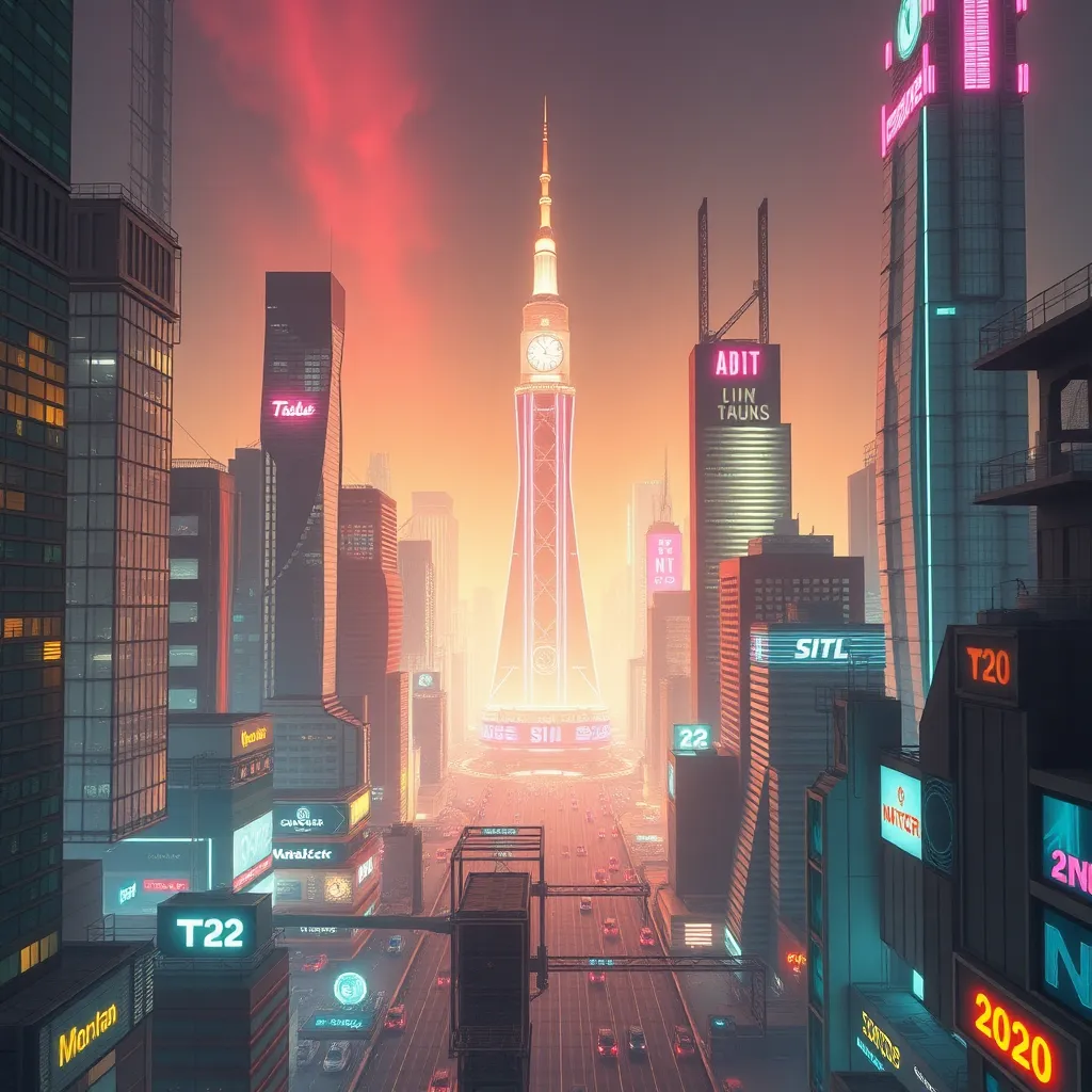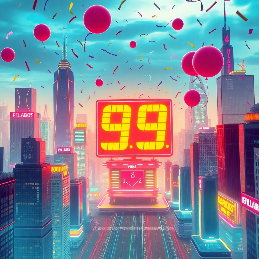 Create a futuristic cityscape at the turn of the millennium. Neon lights and retro-futuristic skyscrapers dominate the skyline. A giant digital clock reads '99' as confetti and balloons float through the air. Incorporate a mix of old and new technology, like flip phones and hoverboards, amidst a vibrant color palette.