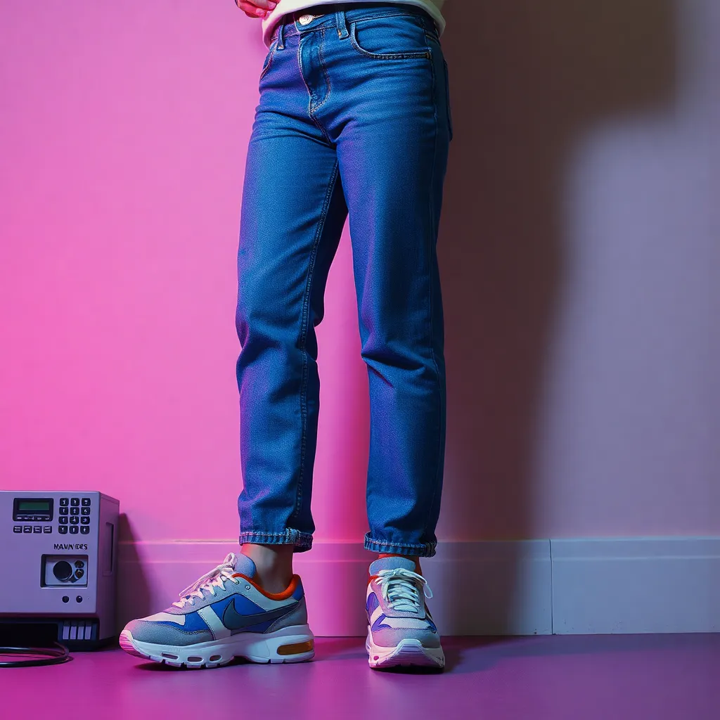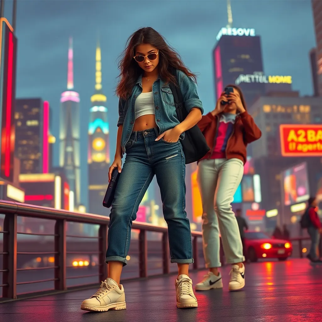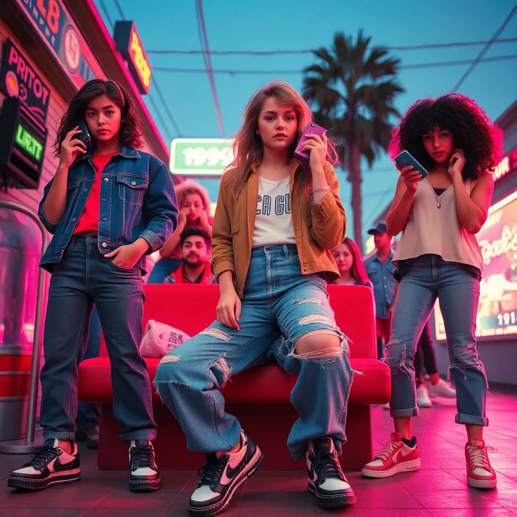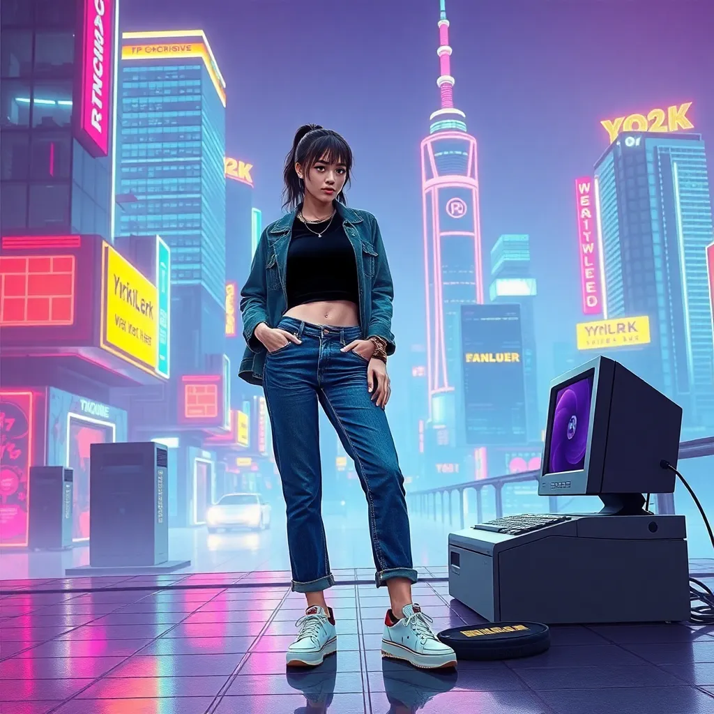 Create an AI image that captures the essence of the Y2K era. Incorporate neon-lit cityscapes, flip phones, and retro-futuristic architecture. Think low-rise jeans, crop tops, and chunky sneakers. Add a touch of nostalgia with a old-school computer or a VHS tape. The result should be a futuristic yet retro-chic scene.