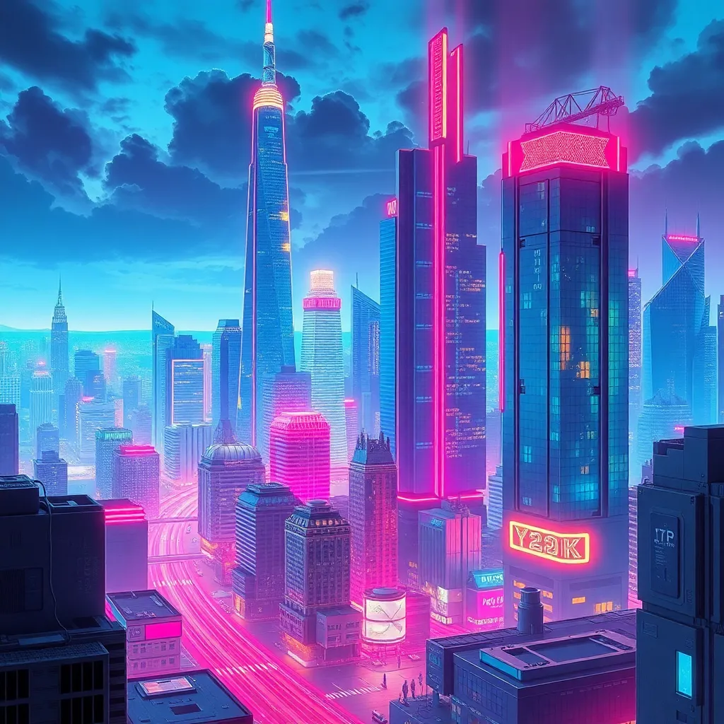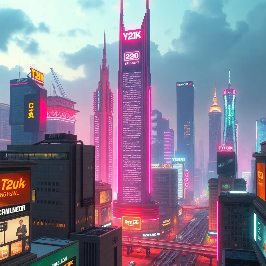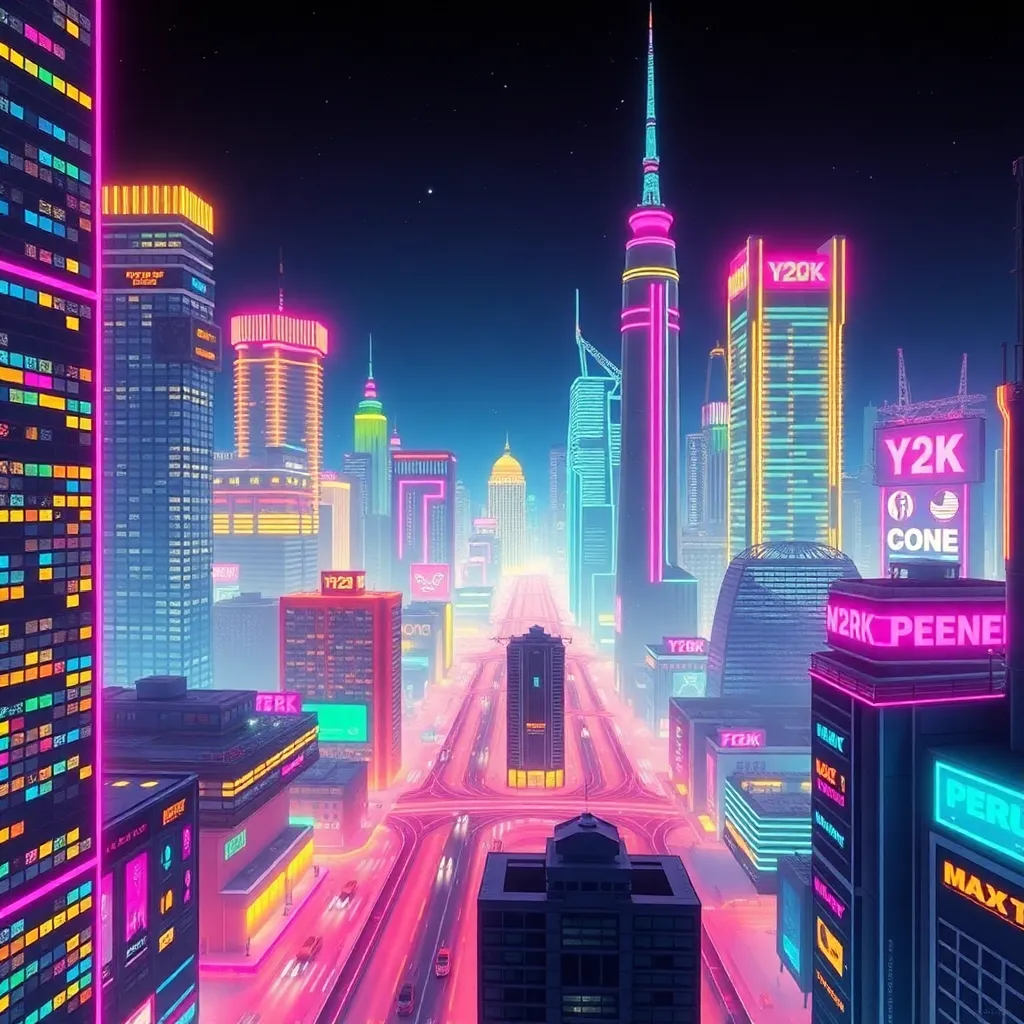 Create an image that embodies the Y2K aesthetic, capturing the essence of the early 2000s. Incorporate elements such as neon lights, retro computer graphics, and bold fonts. Imagine a futuristic cityscape with a futuristic skyscraper, neon-lit streets, and a retro-futuristic atmosphere. Use a mix of vibrant colors and textures.