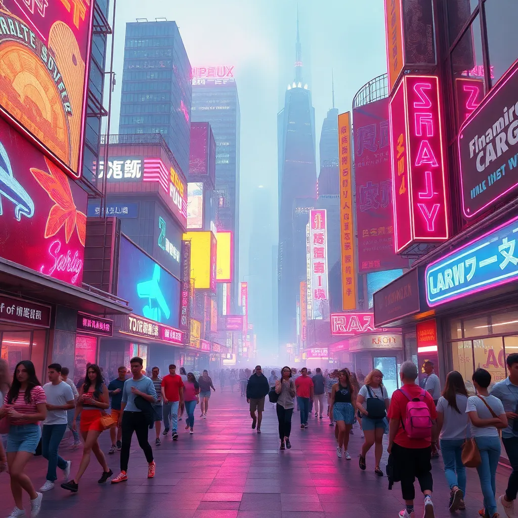 Create an image that captures the essence of the Y2K era, a time of radical change and neon-lit optimism. Imagine a futuristic cityscape with towering skyscrapers, holographic advertisements, and a riot of color. Incorporate retro-futuristic elements like flip phones, cassette tapes, and low-rise jeans. Let the nostalgia wash over you!