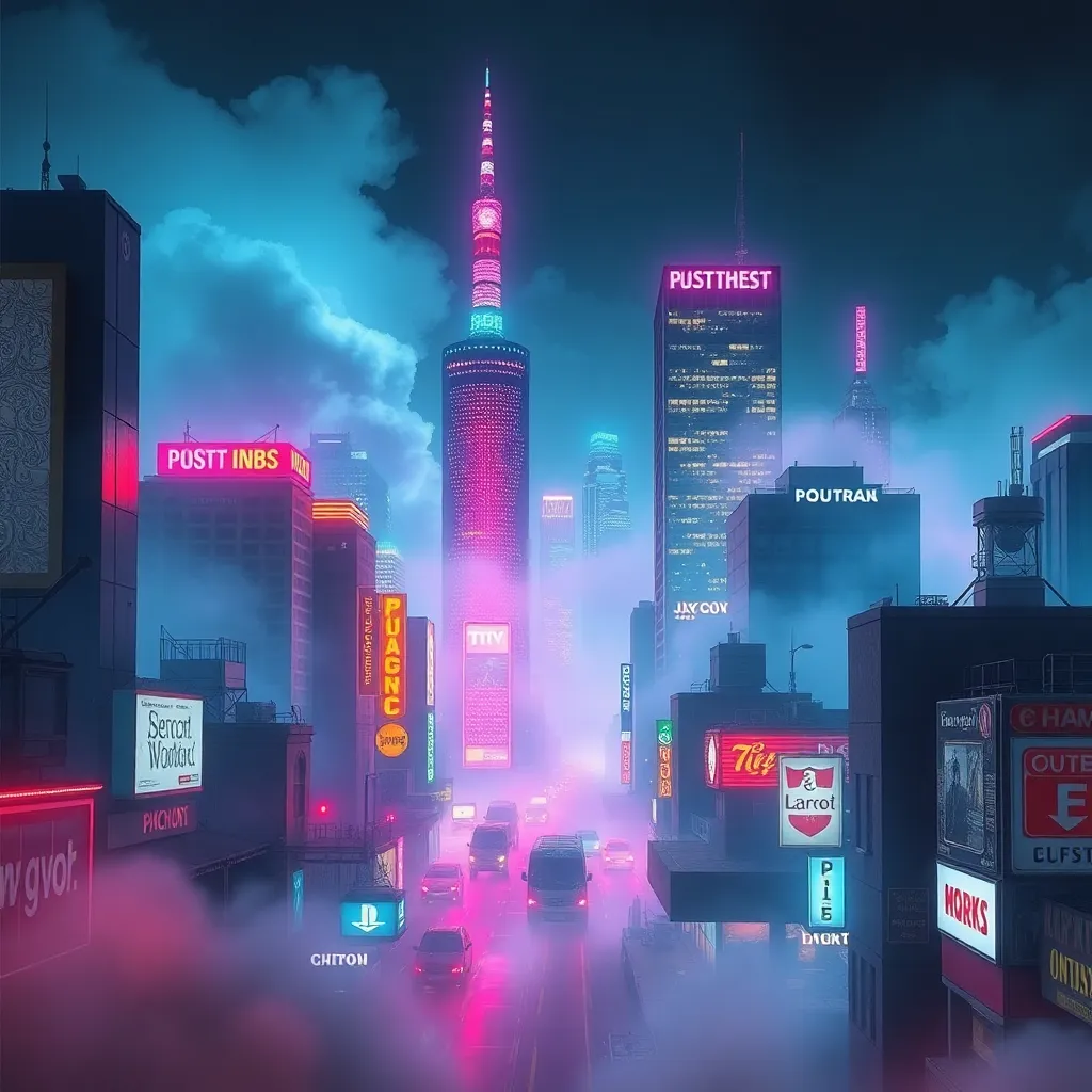 Create a futuristic cityscape with a nostalgic twist, inspired by the Y2K era. Imagine a metropolis with retro-futuristic skyscrapers, neon lights, and a hint of cyberpunk flair. Incorporate iconic elements like flip phones, cassette tapes, and pagers to capture the essence of the late 1990s and early 2000s.