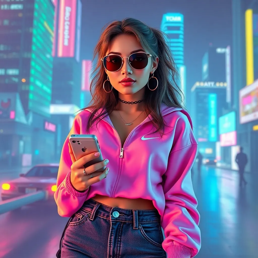 Create an image that embodies the Y2K aesthetic, blending elements of early 2000s pop culture, retro technology, and a touch of nostalgia. Incorporate iconic symbols like flip phones, low-rise jeans, and Juicy Couture tracksuits. Set against a neon-lit, cityscape background, with a hint of futuristic sci-fi flair.