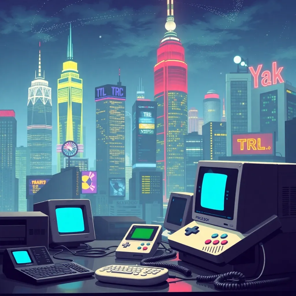Create an image that captures the essence of the Y2K era. A retro-futuristic cityscape with neon-lit skyscrapers, old-school computers, and corded phones. Incorporate pixel art, a Game Boy, and a flip phone. The atmosphere should be nostalgic and playful, with a hint of anxiety and uncertainty. Think 'TRL' and 'Pokémon'.