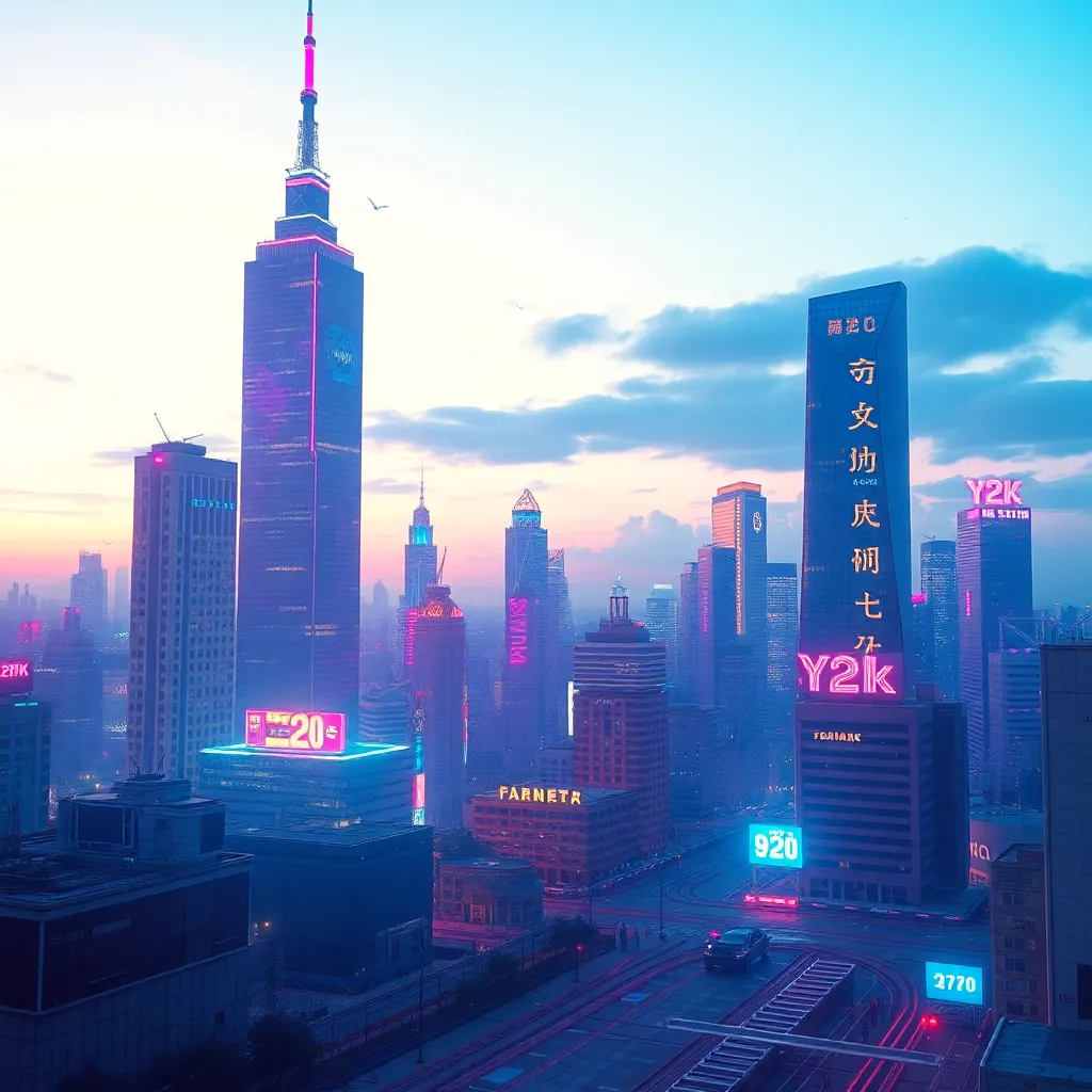 Create a futuristic cityscape at the turn of the millennium. Incorporate neon-lit skyscrapers, retro-futuristic architecture, and a sense of nostalgia. Think 'Tron' meets 'The Matrix' with a dash of 'TRL' and 'Frosted Tips' nostalgia. Use bold colors, geometric shapes, and a touch of grunge to capture the essence of Y2K style.
