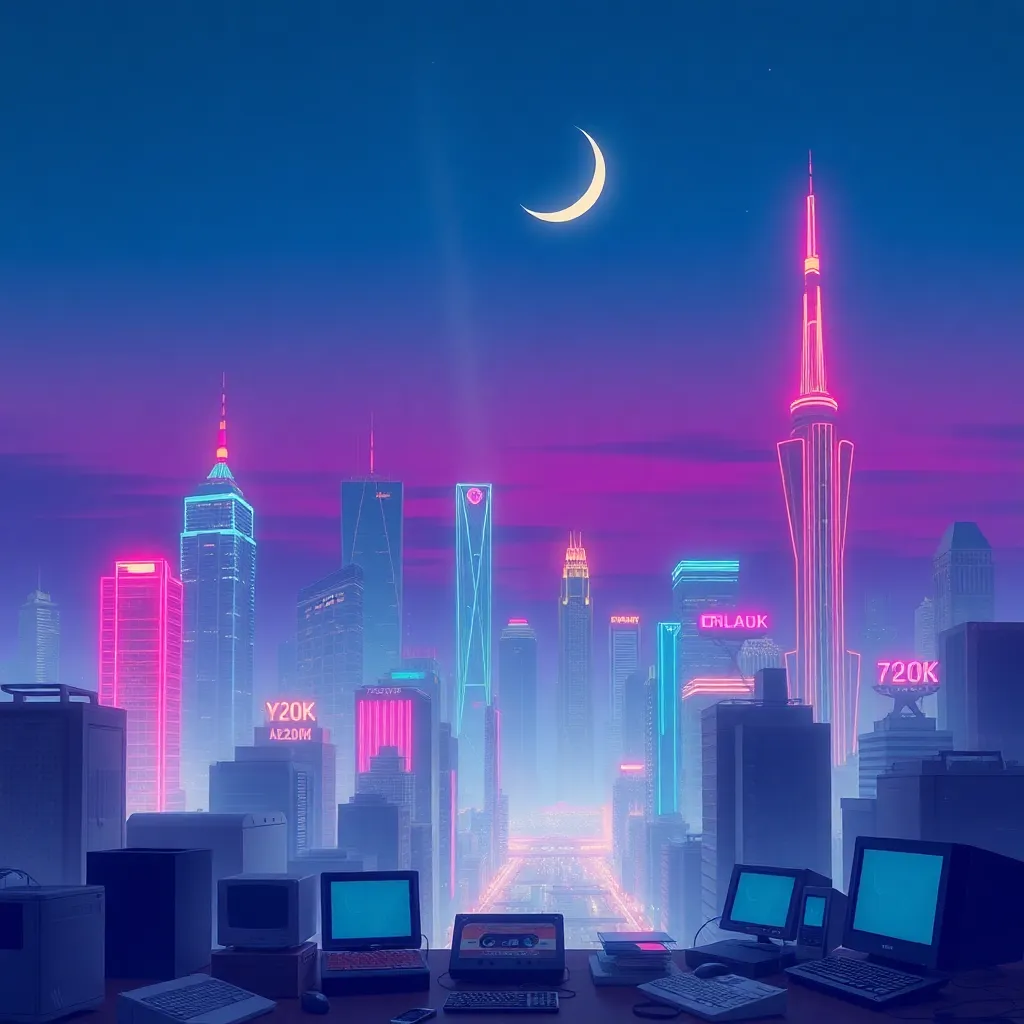 Create a futuristic cityscape inspired by the Y2K era, with neon-lit skyscrapers, retro-futuristic architecture, and a hint of cyberpunk flair. Incorporate elements like dot matrix screens, cassette tapes, and old-school computers to evoke a nostalgic feel. Imagine a world on the cusp of a new millennium, where technology and humanity collide.