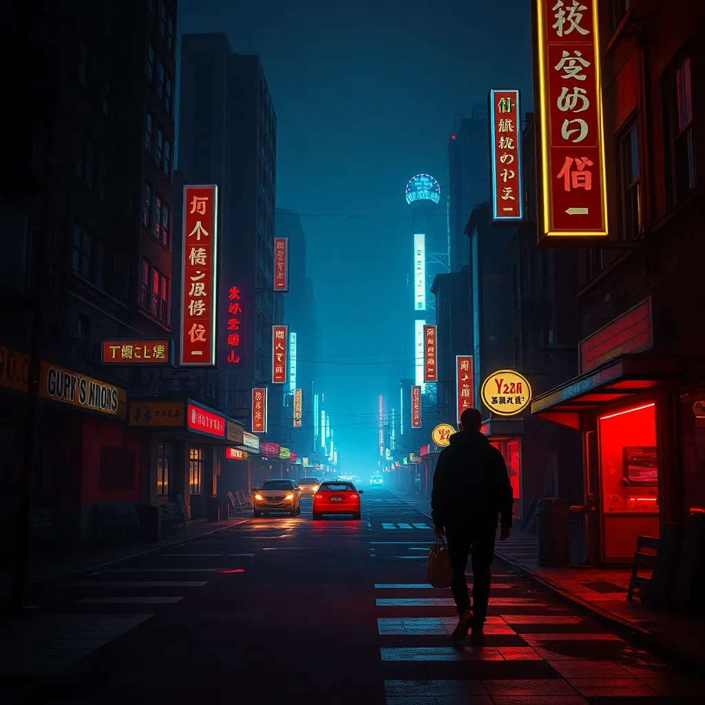Create an eerie and nostalgic scene set in the year 1999, just before the Y2K bug is expected to wreak havoc. Depict a dimly lit, retro-futuristic cityscape with flickering neon lights, abandoned streets, and a sense of impending doom. Incorporate 90s-inspired fashion and technology, such as flip phones and beepers.