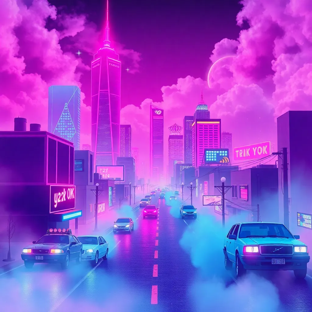 Create an image that captures the nostalgic essence of the Y2K era. Imagine a futuristic cityscape with neon-lit skyscrapers, retro-futuristic vehicles, and a haze of pixelated smoke. Incorporate iconic symbols of the time, such as flip phones, cassette tapes, and low-rise jeans. The color palette should be a blend of neon pinks, blues, and purples.