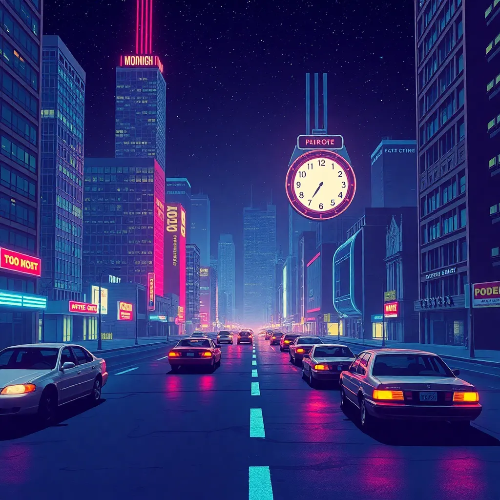 Create a retro-futuristic scene set in the year 1999, just before the Y2K scare. Depict a neon-lit cityscape with a giant clock tower in the background, surrounded by retro-futuristic architecture, hoverboards, and futuristic cars. Incorporate a sense of nostalgia and unease as the clock strikes midnight.