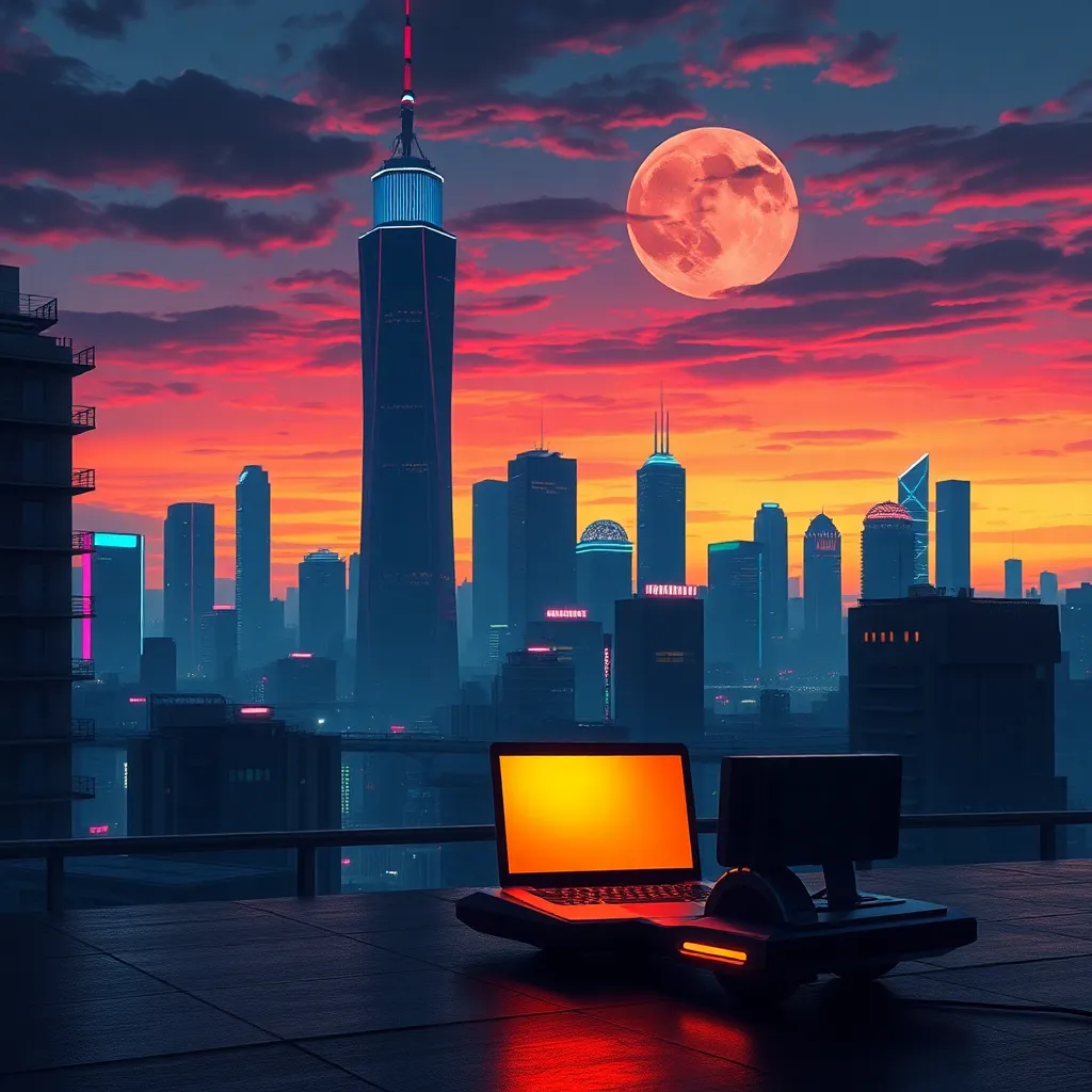 Create a nostalgic scene of a retro-futuristic cityscape at sunset, blending elements of 90s technology and architecture. Incorporate neon lights, pixel art, and a hint of cyberpunk. Include a futuristic skyscraper, a hoverboard, and a retro-style laptop with a glowing screen. The atmosphere should be moody and futuristic.
