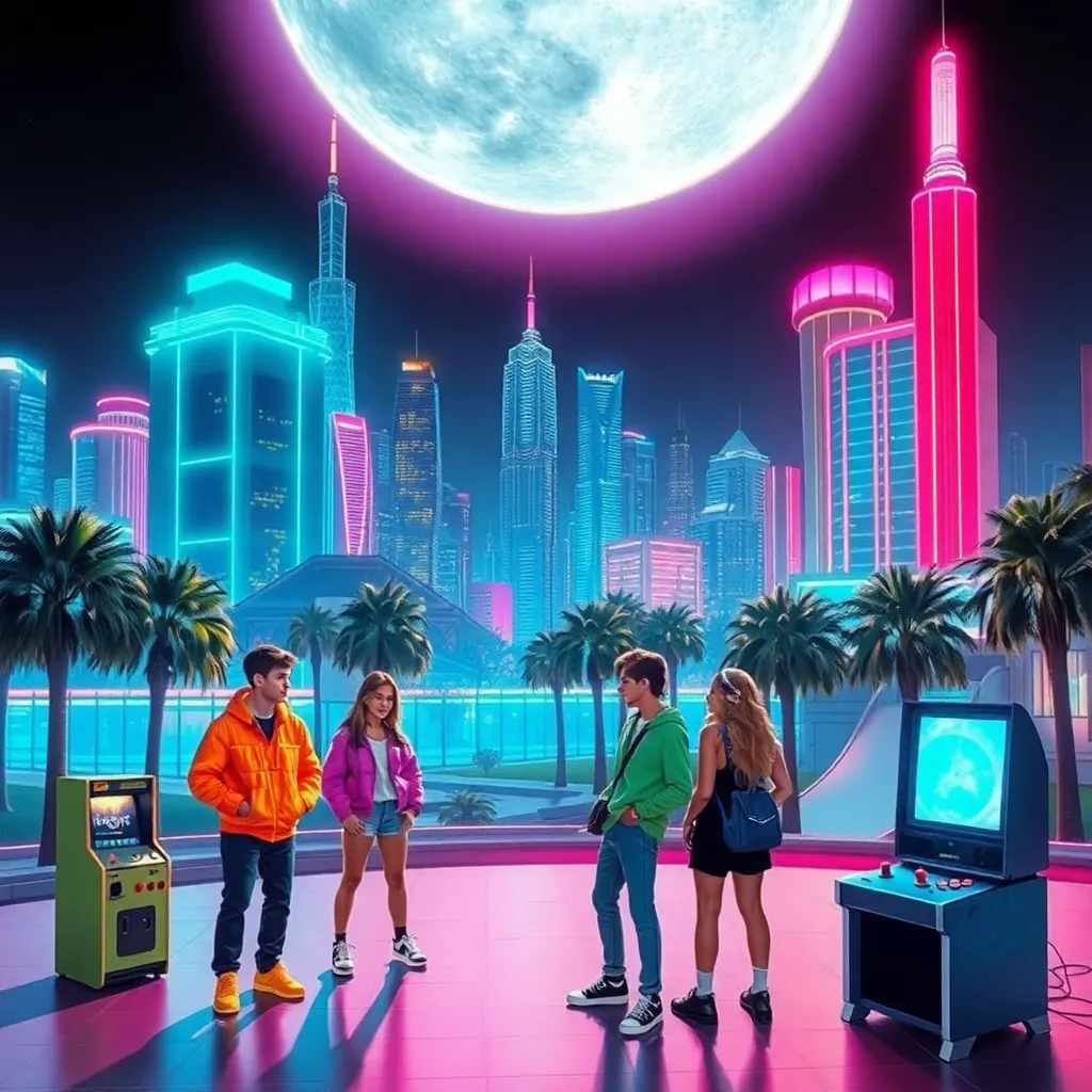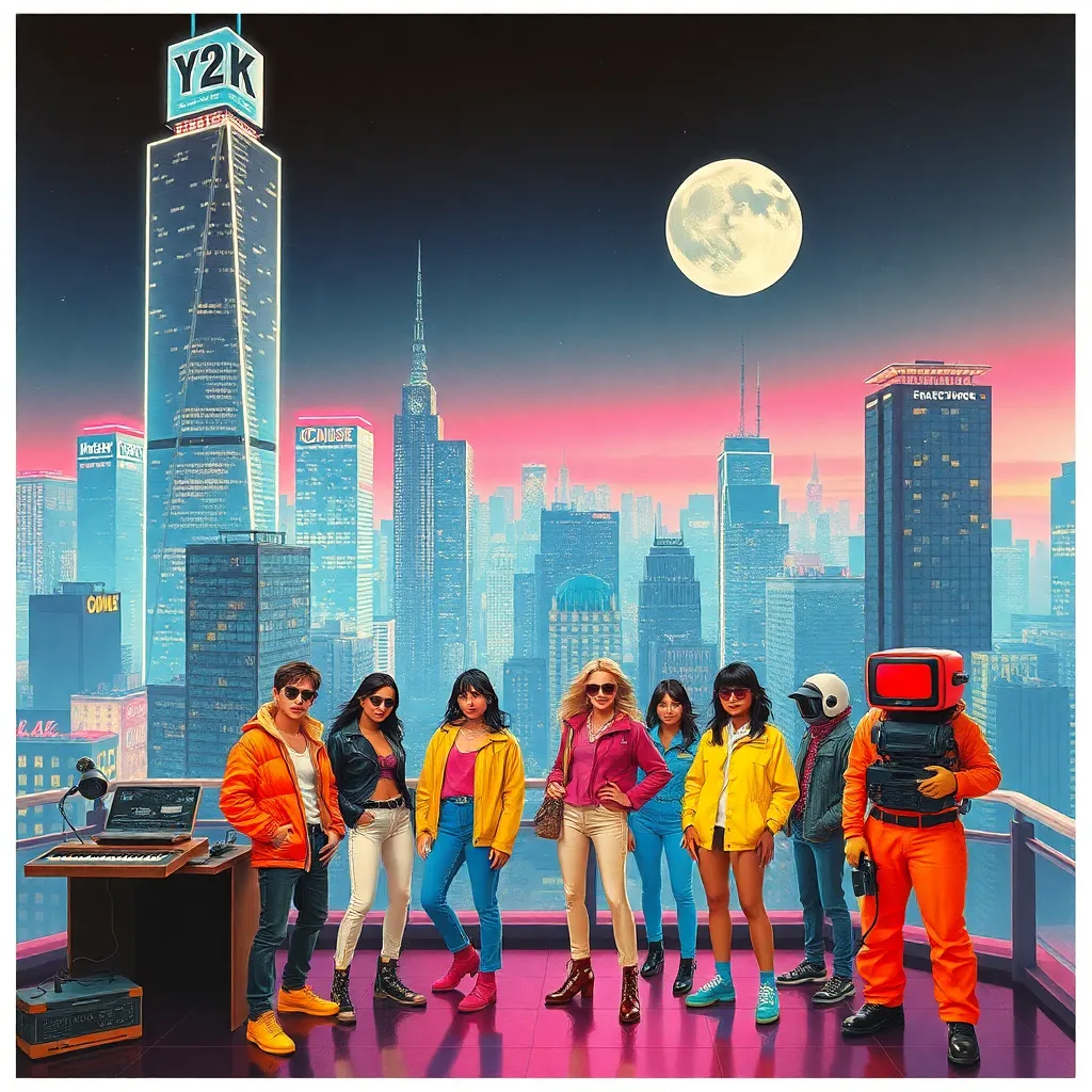 Create an AI image that captures the essence of the Y2K era, featuring a retro-futuristic cityscape with neon-lit skyscrapers, a full moon hanging low in the sky, and a group of people in bold, colorful outfits, surrounded by futuristic gadgets and retro technology, with a hint of nostalgia and wonder.
