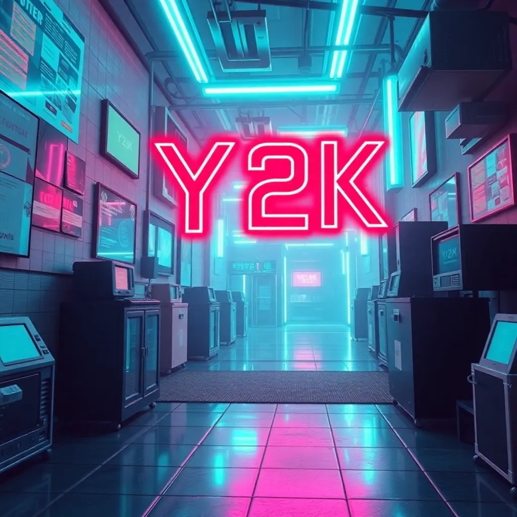 Create an image that captures the essence of the Y2K era (2000-2004). Incorporate neon colors, pixelated graphics, and a mix of futuristic and retro elements. Think flip phones, low-rise jeans, and crop tops. The scene could be set in a dimly lit club, a retro arcade, or a bedroom with a messy desk and a TV playing MTV. Make it a nostalgic nod to the dawn of the new millennium.