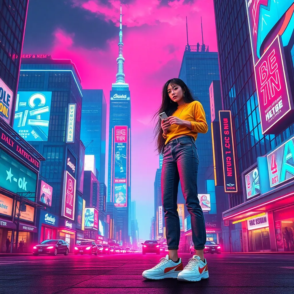 Create an image that captures the nostalgia of the Y2K era. Incorporate elements like flip phones, low-rise jeans, and chunky sneakers. A retro-futuristic cityscape with neon lights and skyscrapers should be the backdrop. Add a sense of excitement and possibility, as if the world is on the cusp of a new millennium.